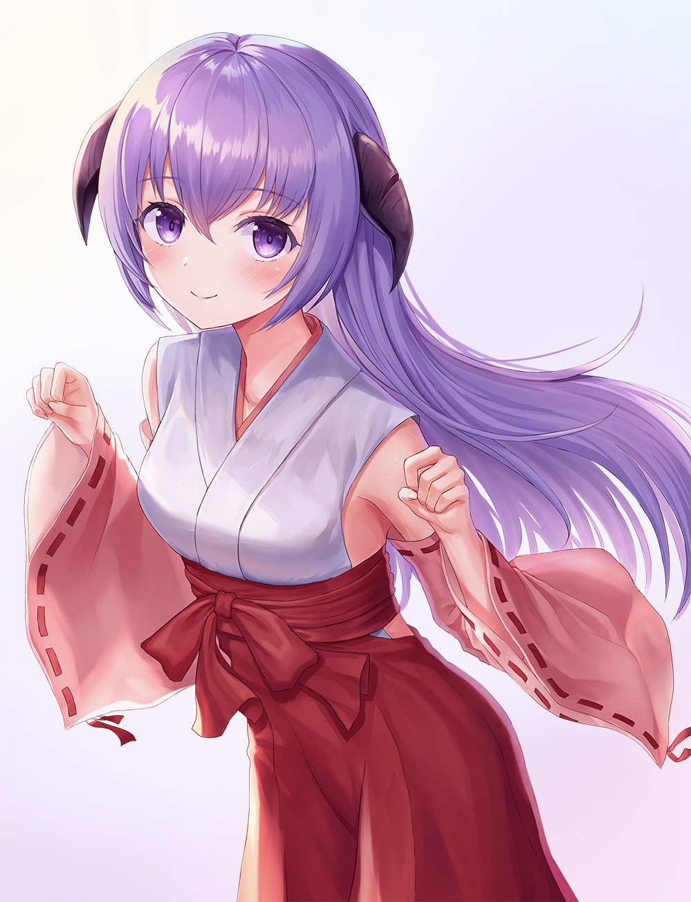 1girl bad_id bad_pixiv_id bare_shoulders blush breasts closed_mouth commentary_request curled_horns detached_sleeves grey_background hair_between_eyes hakama hakama_skirt hanyuu highres higurashi_no_naku_koro_ni horns japanese_clothes kimono long_hair long_sleeves looking_at_viewer pink_sleeves purple_eyes purple_hair red_hakama ribbon-trimmed_sleeves ribbon_trim seungju_lee skirt sleeveless sleeveless_kimono small_breasts smile solo upper_body very_long_hair white_kimono wide_sleeves