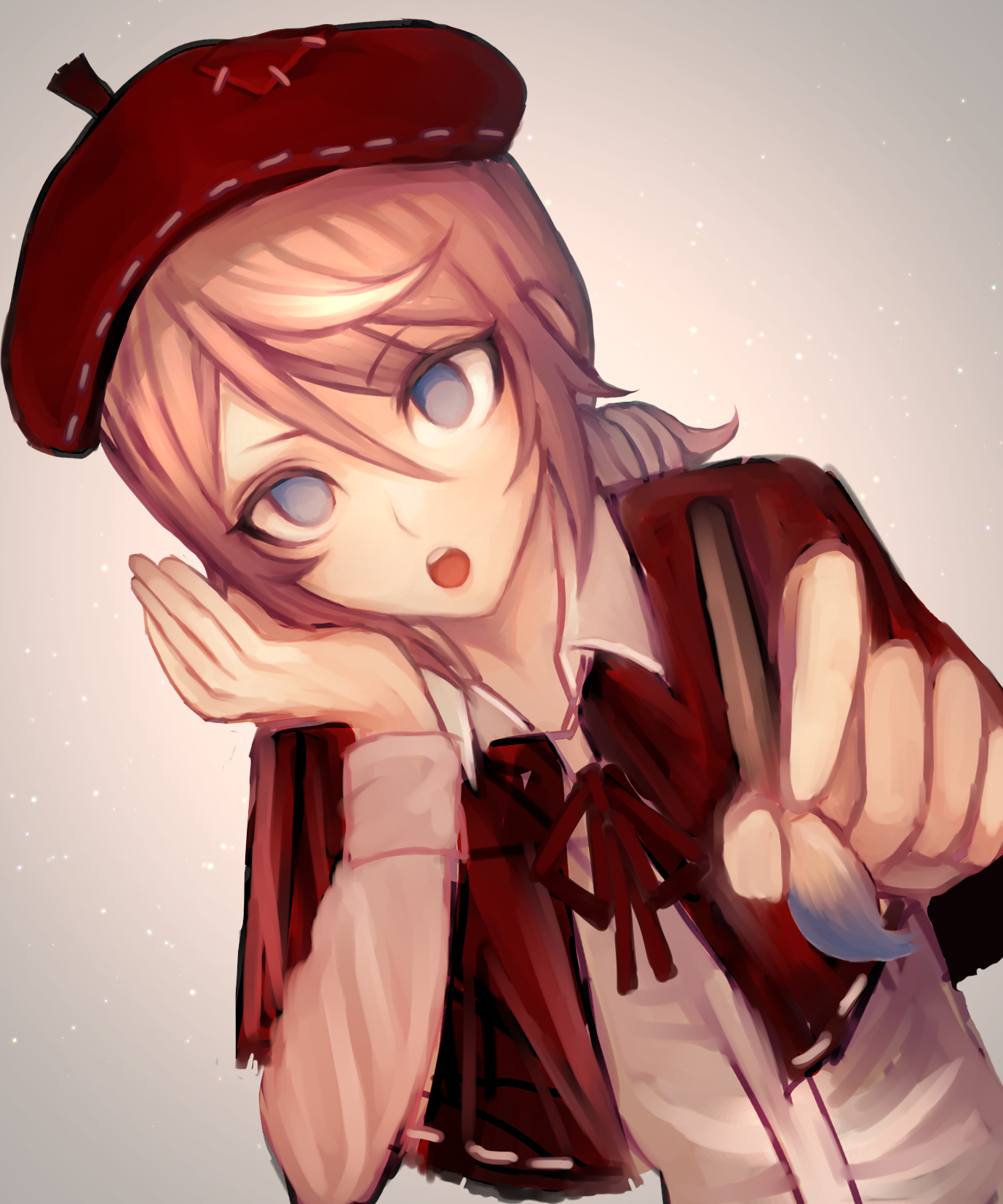 :o bad_id bad_pixiv_id beret blue_eyes brown_hair capelet collared_shirt edgar_valden eyes_visible_through_hair foreshortening hair_between_eyes hamigakiko hat head_rest head_tilt highres holding holding_paintbrush identity_v komatsuzaki_rui_(style) light_particles long_hair long_sleeves looking_at_viewer paintbrush painting_(action) red_hat shirt solo teeth upper_body upper_teeth_only white_shirt