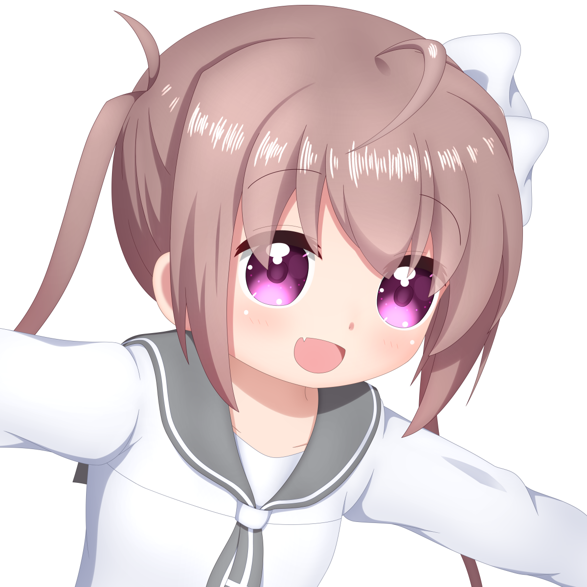 ahoge artist_request bow brown_hair fang grey_sailor_collar highres momochi_tamate purple_eyes sailor_collar school_uniform slow_start twintails white_bow