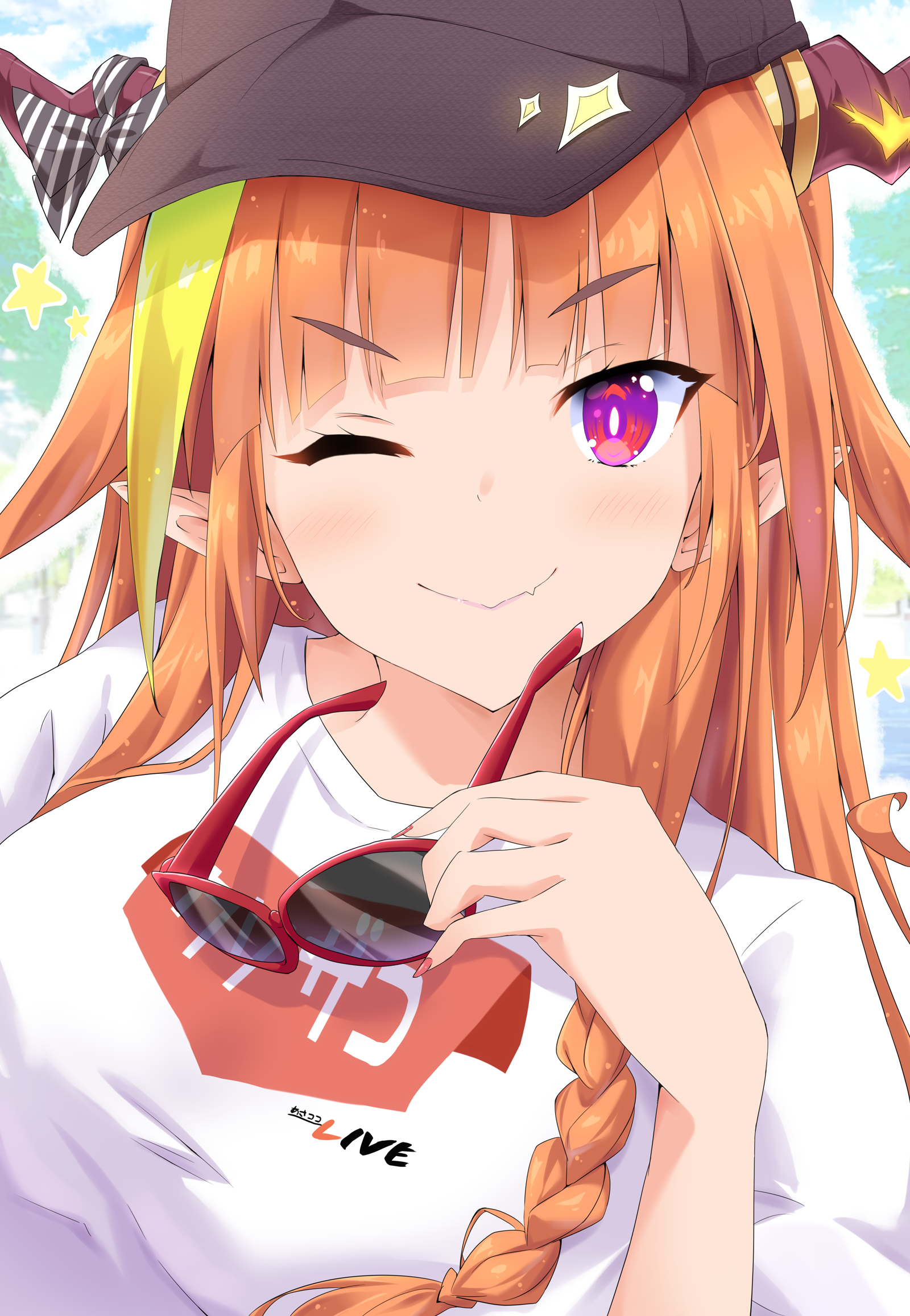 1girl baseball_cap black_hat blouse blunt_bangs bow braid closed_mouth diagonal-striped_bow dragon_girl dragon_horns fang fang_out fingernails gradient_eyes hat highres holding holding_removed_eyewear hololive horns kiryu_coco kurono_yuzuko logo long_hair looking_at_viewer multicolored_eyes nail_polish one_eye_closed orange_hair pointy_ears portrait print_shirt purple_eyes red_eyes sharp_fingernails shirt side_braid single_braid skin_fang smile solo striped_bow sunglasses t-shirt tareme unworn_eyewear v-shaped_eyebrows virtual_youtuber white_shirt