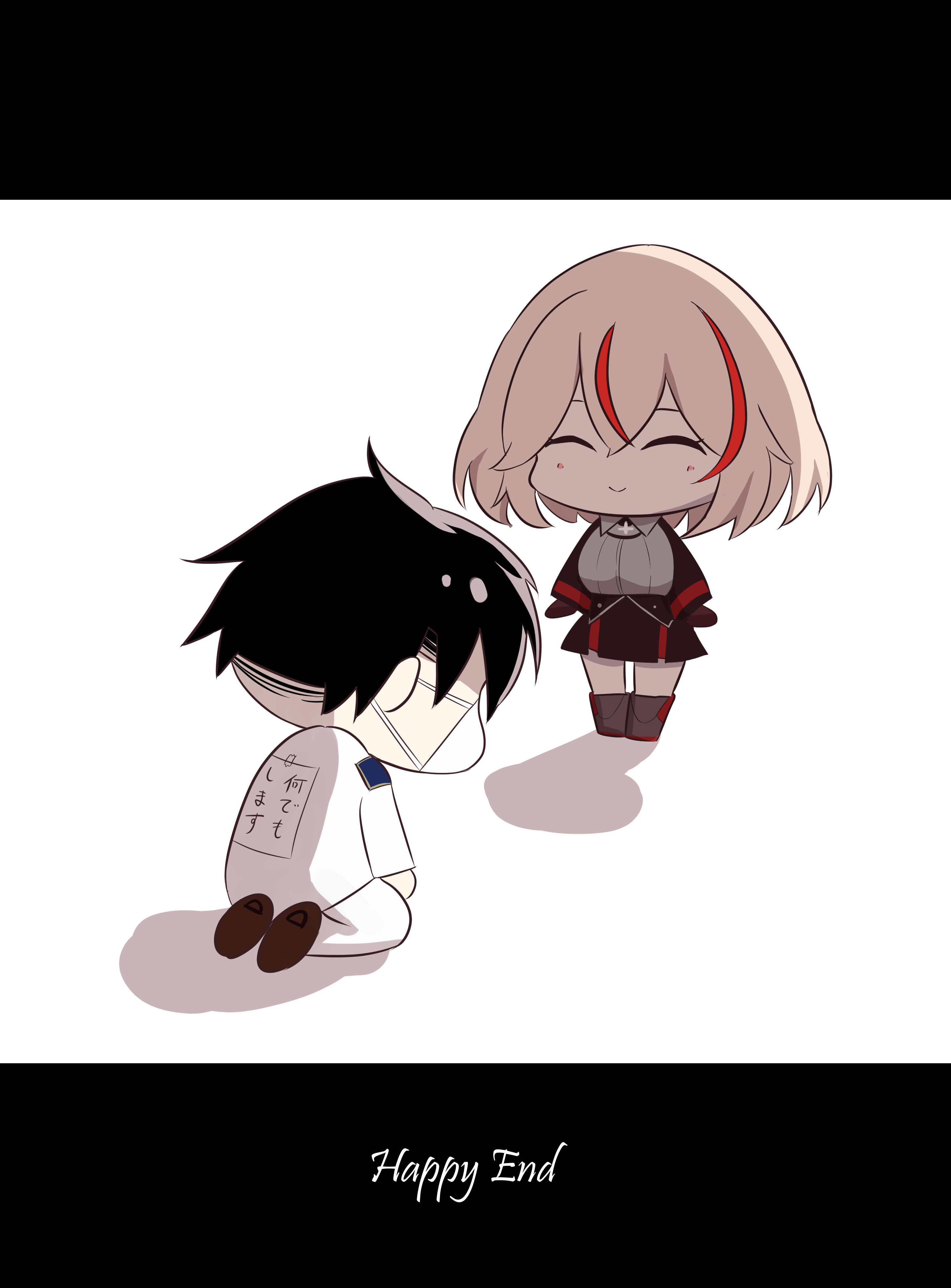 1boy 1girl absurdres azur_lane black_hair black_skirt breast_cutouts brown_footwear chibi closed_eyes commander_(azur_lane) highres jacket letterboxed light_brown_hair mask mouth_mask multicolored_hair pants red_hair roon_(azur_lane) short_hair simple_background skirt streaked_hair white_background white_jacket white_pants yomare