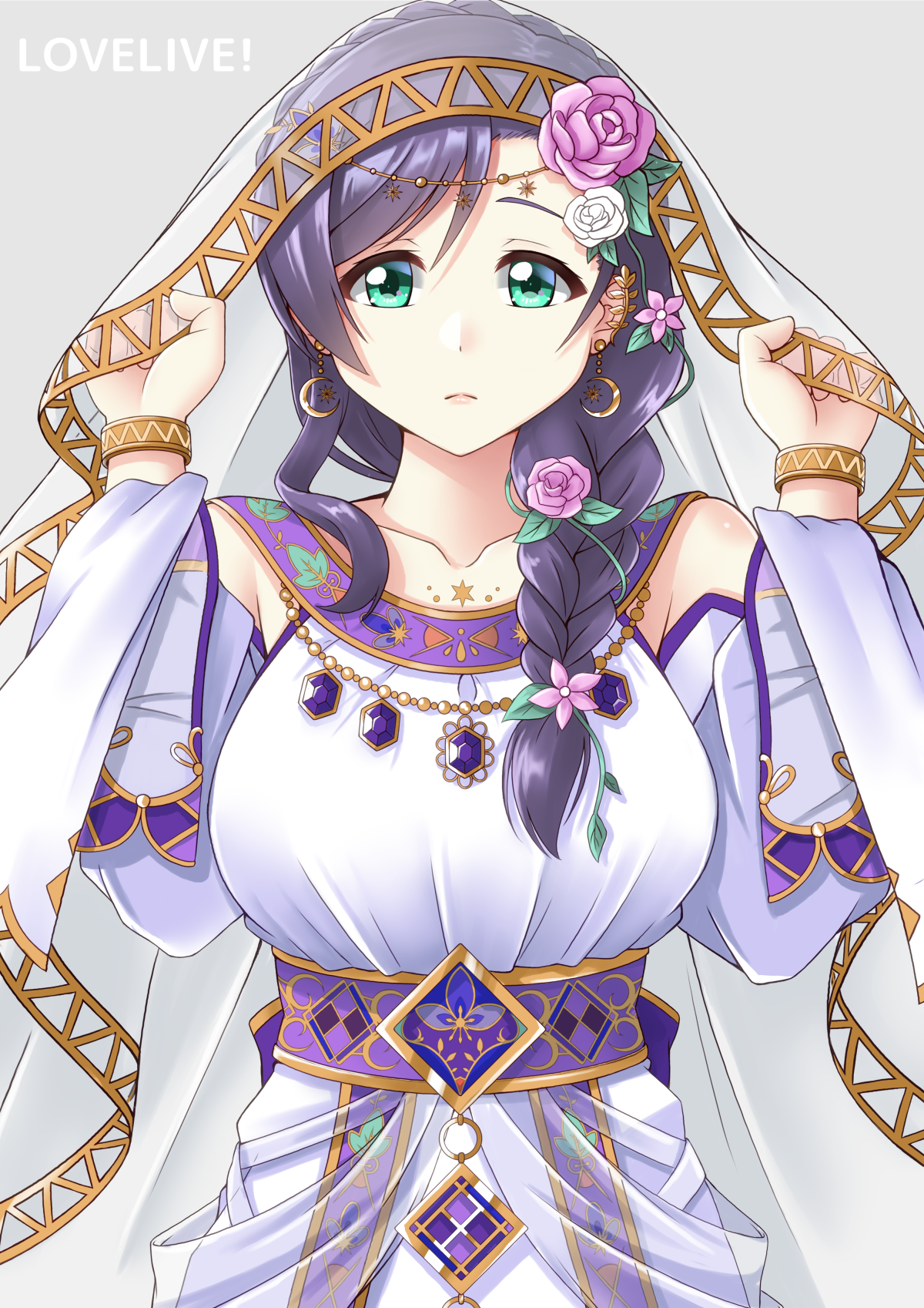 1girl belt bracelet braid breasts collarbone copyright_name cowboy_shot crescent crescent_earrings crown_braid detached_sleeves dress earrings gradient_background grey_background hair_over_shoulder highres holding_veil jewelry large_breasts long_hair looking_at_viewer love_live! love_live!_school_idol_festival_all_stars love_live!_school_idol_project necklace purple_hair raised_eyebrows sano_souichi single_braid sleeveless sleeveless_dress solo swept_bangs tareme tojo_nozomi tojo_nozomi_(guided_by_fate) veil white_dress white_sleeves wide_sleeves