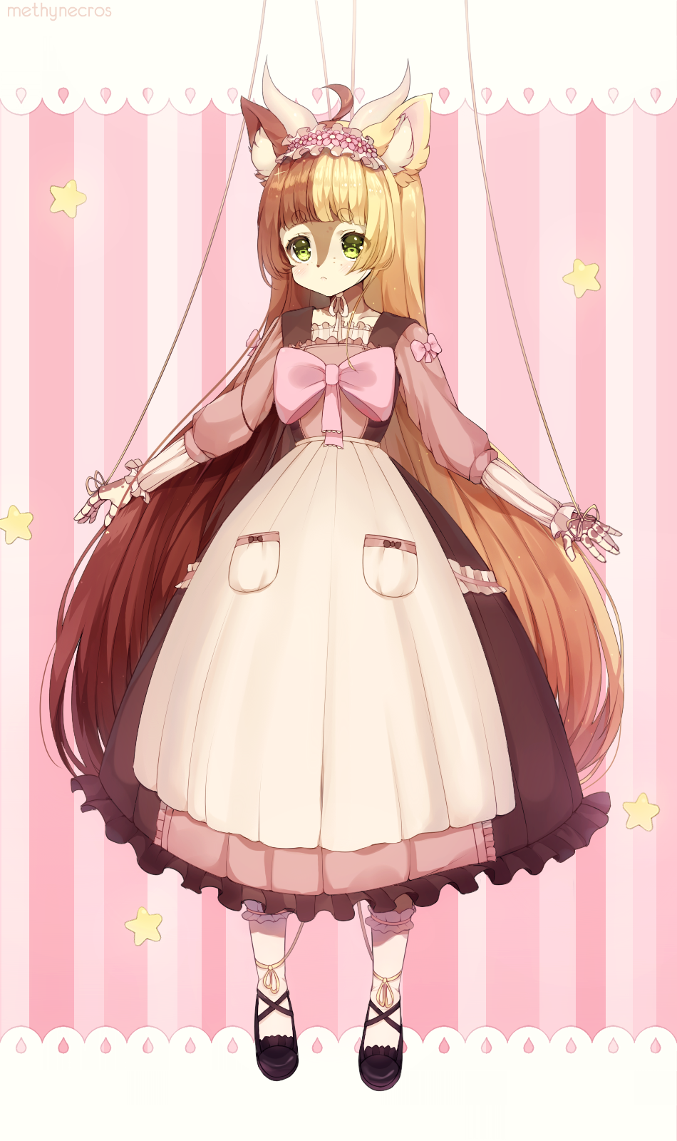 1girl animal_ear_fluff animal_ears apron artist_name black_shoes blonde_hair blunt_bangs blush bow brown_hair closed_mouth collarbone commission deer_ears doll doll_joints dress female_focus flat_chest flower freckles frilled_dress frills full_body furry furry_female green_eyes hairband highres horns joints light_blush long_hair methynecros multicolored_hair original pink_background pink_bow pink_flower pink_hairband pocket puppet_strings shoes sidelocks simple_background socks solo split-color_hair standing star_(symbol) string striped_background tail two-tone_hair very_long_hair waist_apron watermark white_socks