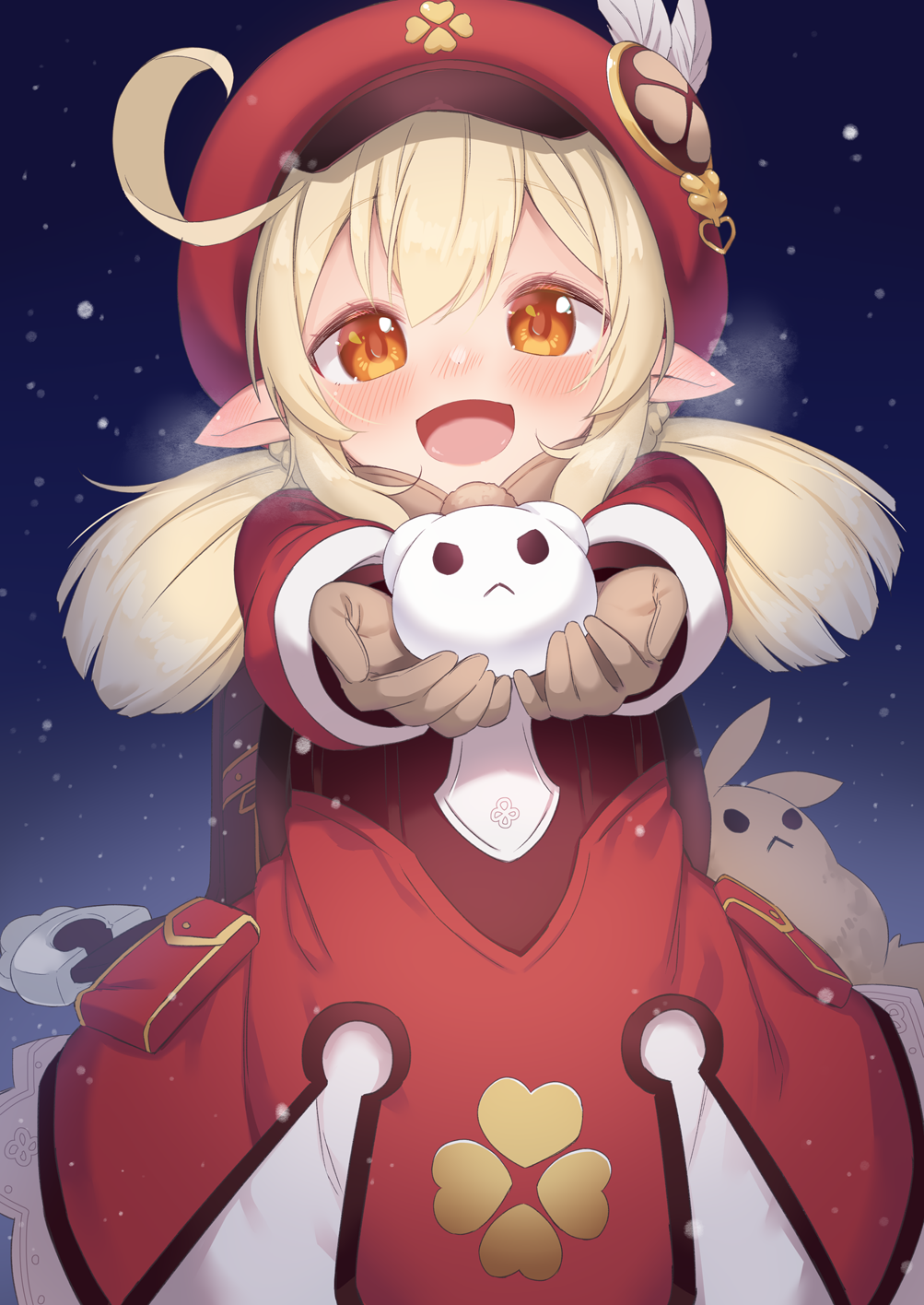1girl :d ahoge blonde_hair blush brown_eyes brown_gloves newsboy_cap dress feathers genshin_impact gloves hair_between_eyes hat hat_feather highres holding klee_(genshin_impact) long_hair long_sleeves looking_at_viewer low_twintails muku_(muku-coffee) open_mouth outstretched_arms pointy_ears red_dress red_hat smile solo twintails white_feathers