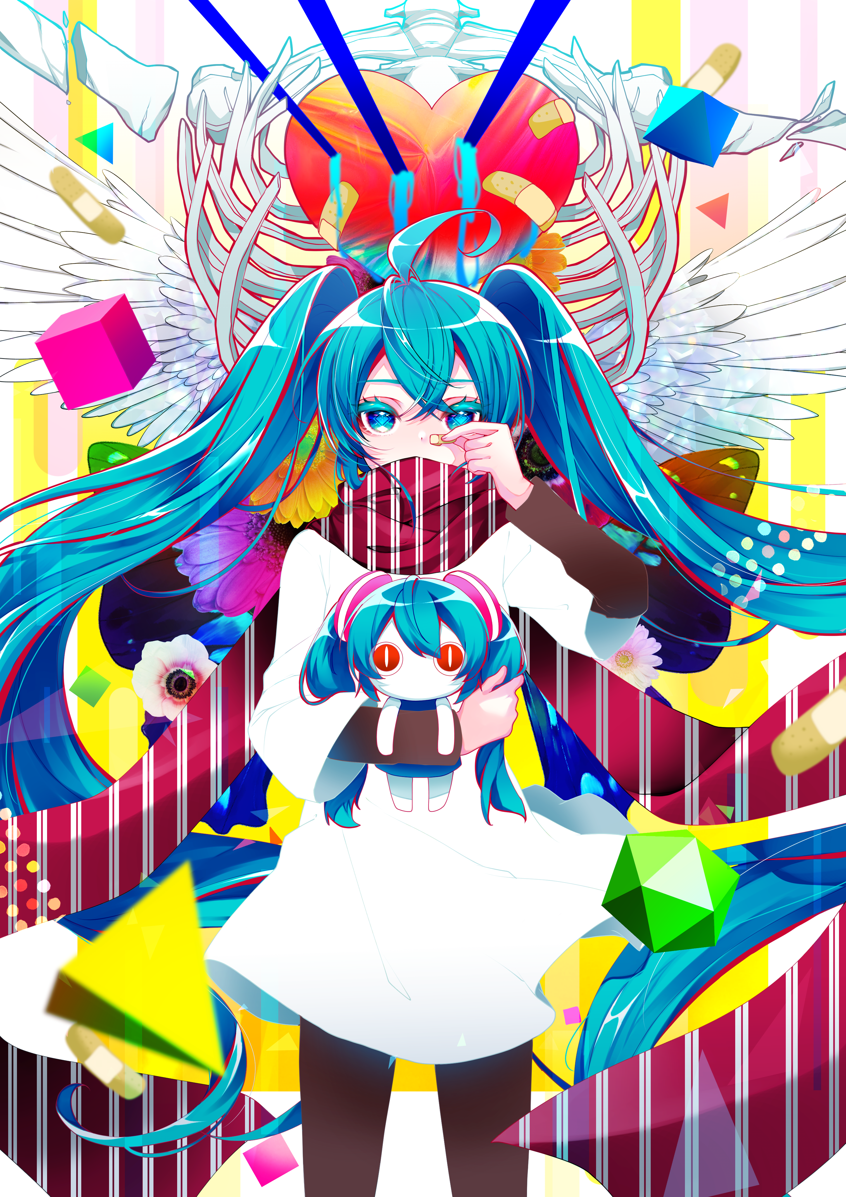 2girls absurdres ahoge aimaina aqua_eyes aqua_hair arifureta_sekai_seifuku_(vocaloid) bandaid bandaid_on_face bandaid_on_nose black_pants black_sleeves bleeding blood commentary cowboy_shot cube dress flower hair_ornament hatsune_miku heart highres holding long_hair looking_at_viewer multiple_girls pants poppy_(flower) pyramid_(structure) red_eyes removing_bandaid scarf shirayuki_towa skeleton slit_pupils stab standing striped_clothes striped_scarf triangle twintails very_long_hair vocaloid white_dress