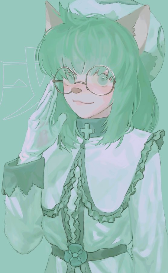 1girl adjusting_eyewear animal_ears arm_at_side bad_id bad_twitter_id cheadle_yorkshire closed_mouth commentary cross dog_ears dog_girl dress glasses gloves green_background green_eyes green_hair green_theme hand_up hat hunter_x_hunter long_hair long_sleeves looking_at_viewer round_eyewear simple_background smile snout solo umi_(k_mpk)