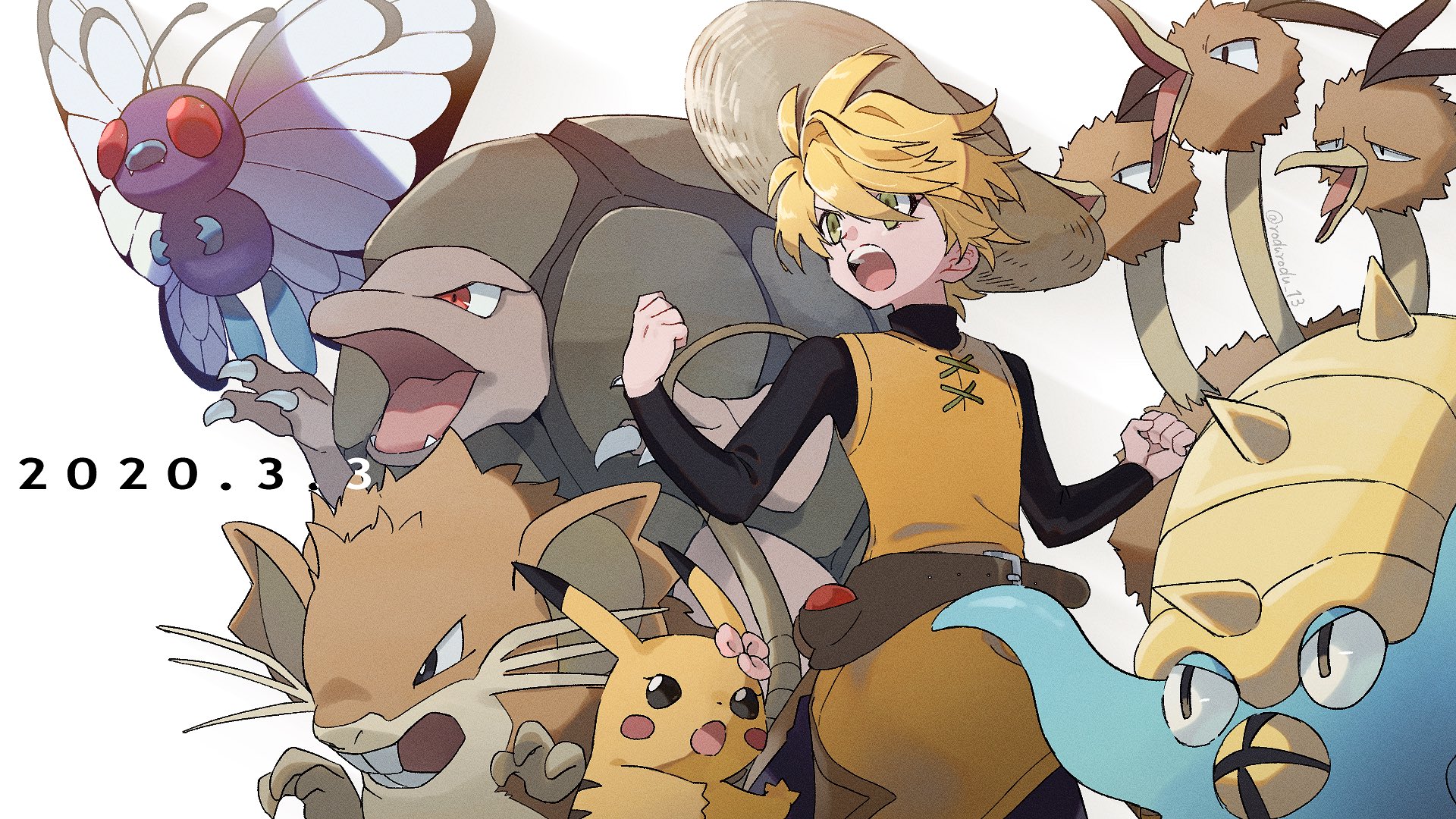 1girl beige_headwear belt blonde_hair butterfree chuchu_(pokemon) clenched_hands commentary_request dated dodrio gen_1_pokemon golem green_eyes hat highres looking_to_the_side nintendo omastar open_mouth pikachu pokemon pokemon_(creature) pokemon_adventures raticate rozu_ki short_hair straw_hat teeth tongue yellow_(pokemon)