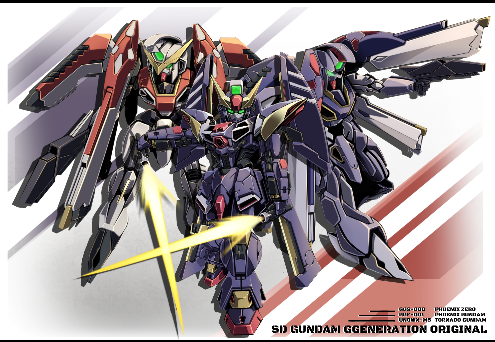character_name chibi energy_gun energy_sword green_eyes gun gundam highres holding holding_gun holding_sword holding_weapon looking_at_viewer looking_down mecha no_humans phoenix_gundam phoenix_zero robot sd_gundam sd_gundam_g_generation sd_gundam_g_generation_original shoulder_cannon sibelurabbi sword tornado_gundam v-fin visor weapon