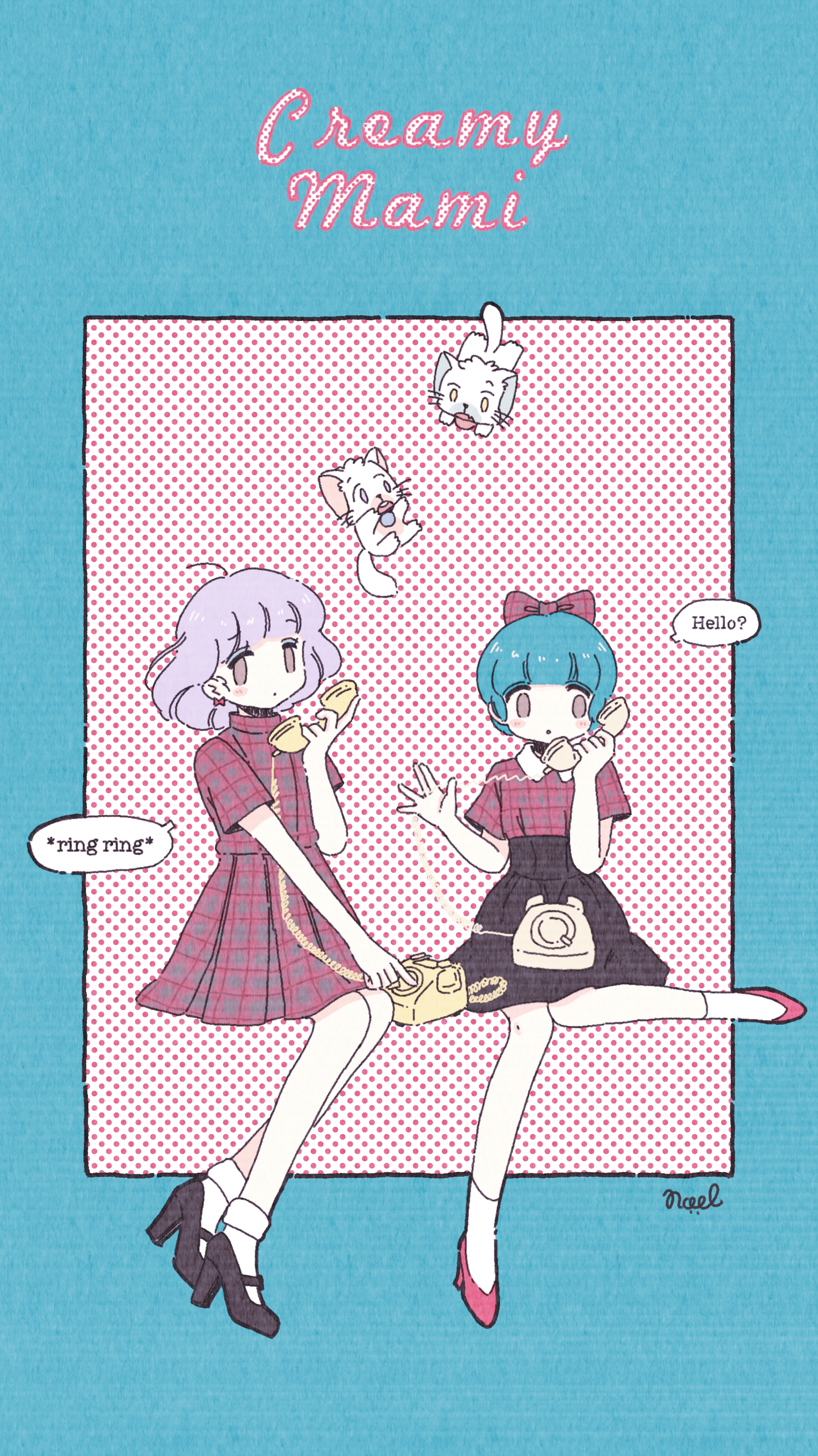 2girls absurdres aqua_hair black_footwear black_skirt blush bow brown_eyes character_name character_request check_character creamy_mami dress earrings english_text hair_bow halftone high_heels highres holding holding_phone invisible_chair jewelry light_purple_hair looking_at_viewer mahou_no_tenshi_creamy_mami morisawa_yuu multiple_girls nega_(creamy_mami) noeru_(noellemonade) phone plaid_bow plaid_clothes plaid_dress plaid_shirt posi_(creamy_mami) red_bow red_dress red_footwear red_shirt shirt shoes short_sleeves sitting skirt speech_bubble