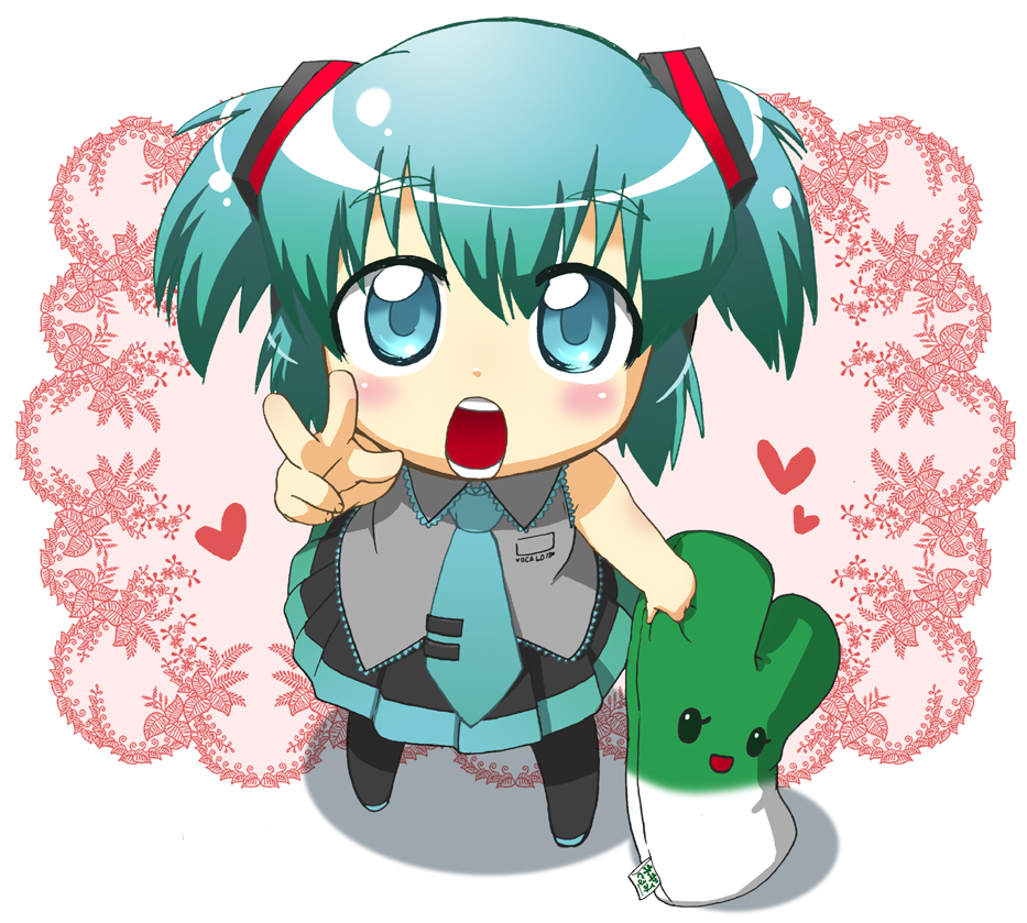 1girl aged_down aqua_eyes aqua_hair chibi child female_focus hatsune_miku necktie nekomura_otako open_mouth pillow short_hair short_twintails skirt solo spring_onion stuffed_animal stuffed_toy tako_suke themed_object thighhighs twintails v vocaloid