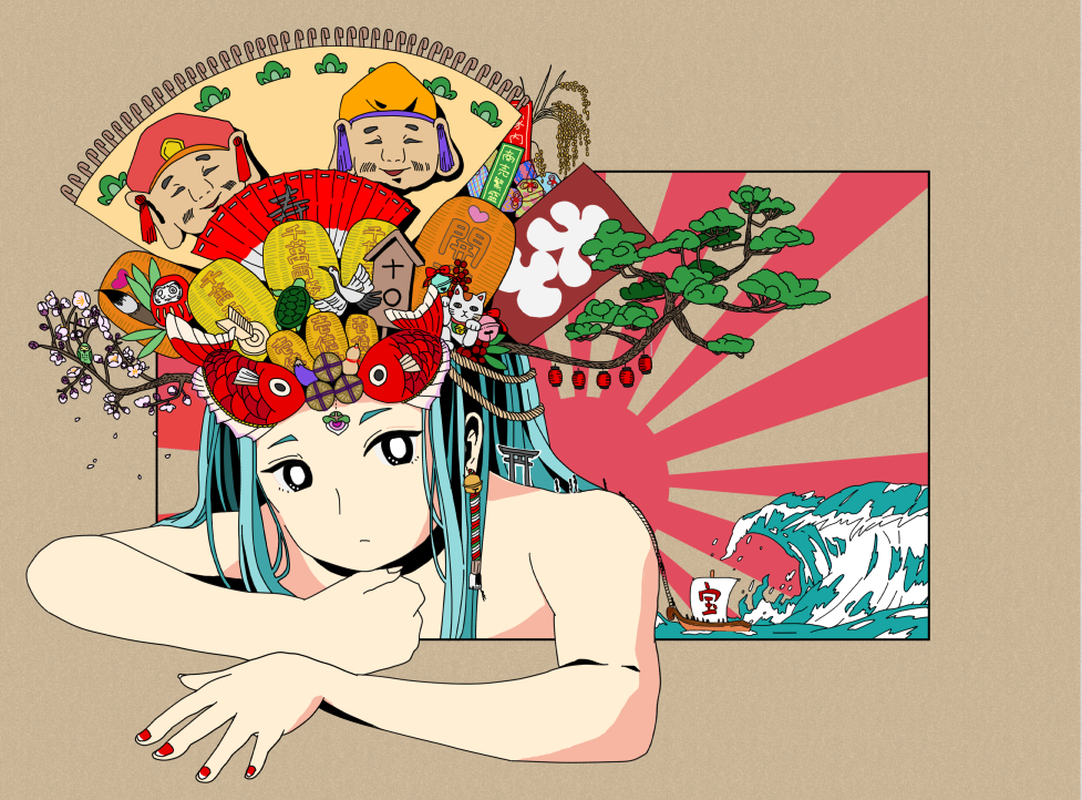 1girl aqua_hair bad_id bad_pixiv_id bare_shoulders bell bird black_eyes boat bright_pupils daruma_doll fish flag looking_at_viewer nail_polish original paintbrush red_nails solo tree upper_body watercraft waves white_flag white_pupils yoshimon