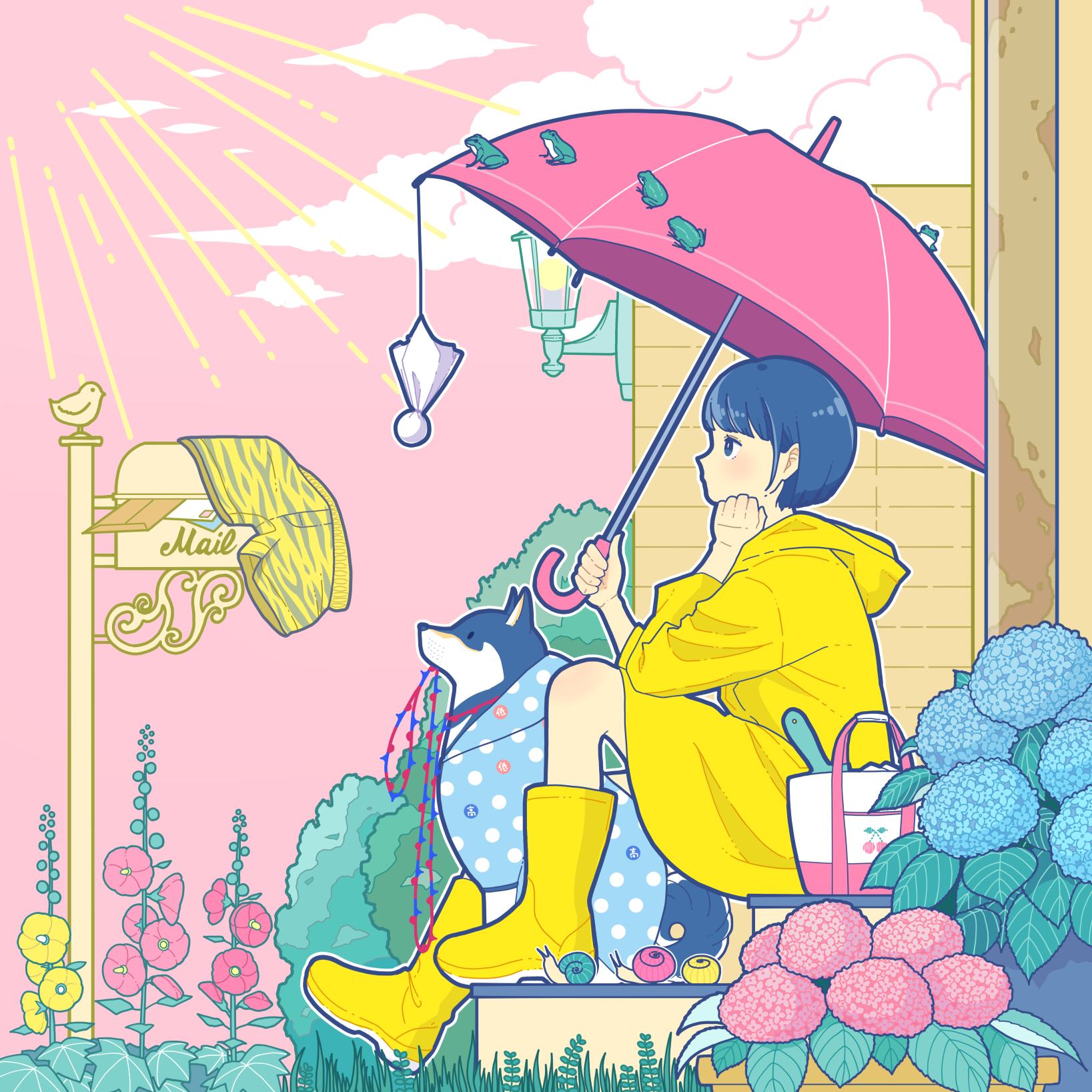 1girl aqua_flower boots cloud cloudy_sky flat_color flower frog highres hollyhock hood hood_down hydrangea jacket leaf original outdoors outline pink_flower pink_sky pink_umbrella plant potted_plant profile raincoat rubber_boots shiba_inu shoes sitting sky snail solo teruterubouzu umbrella white_outline yellow_boots yellow_flower yellow_jacket yellow_raincoat yoshimon