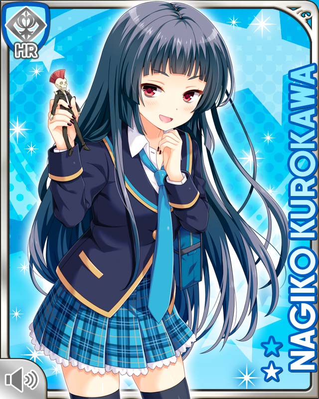 1girl :d action_figure bags_under_eyes black_hair black_jacket black_nails black_thighhighs blue_background blue_necktie blue_skirt blue_theme card_(medium) cowboy_shot frilled_skirt frills girlfriend_(kari) holding jacket kurokawa_nagiko long_hair long_sleeves looking_at_viewer nail_polish necktie official_art open_mouth plaid_clothes plaid_skirt pleated pleated_skirt print_clothes print_skirt qp:flapper red_eyes sailor_collar school_uniform skindentation skirt smile solo standing thighhighs wing_collar zettai_ryouiki