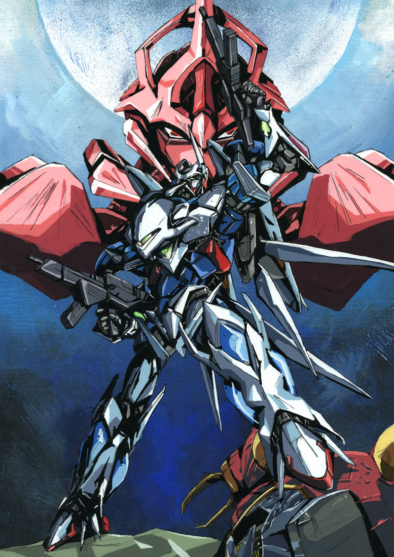 1980s_(style) borrowed_character commentary commission dual_wielding english_commentary green_eyes gun holding holding_gun holding_weapon looking_up marble-v mecha moon no_humans oldschool original retro_artstyle robot science_fiction solo_focus weapon