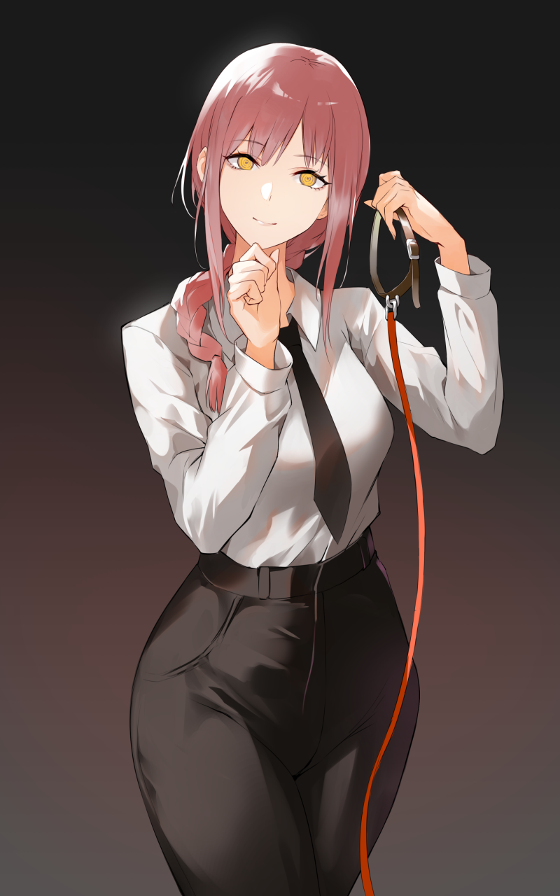 1girl braid breasts chainsaw_man collar formal_clothes gradient_background high-waist_pants highres leash long_hair looking_at_viewer makima_(chainsaw_man) medium_breasts necktie nr_noir pants pink_hair pov shirt_tucked_in smile solo suit viewer_on_leash yellow_eyes