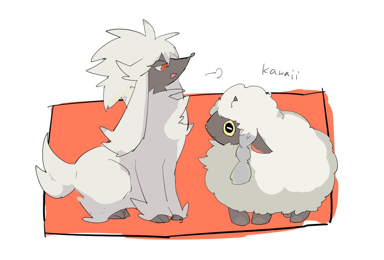 apios bad_id bad_pixiv_id black_eyes closed_mouth colored_sclera from_side full_body furfrou furfrou_(natural) gen_6_pokemon gen_8_pokemon happy horizontal_pupils looking_at_another looking_down nintendo no_humans open_mouth pokemon pokemon_(creature) profile puff_of_air red_background red_eyes romaji_text sideways_mouth simple_background sitting smile standing two-tone_background wavy_mouth white_background white_hair wooloo yellow_sclera