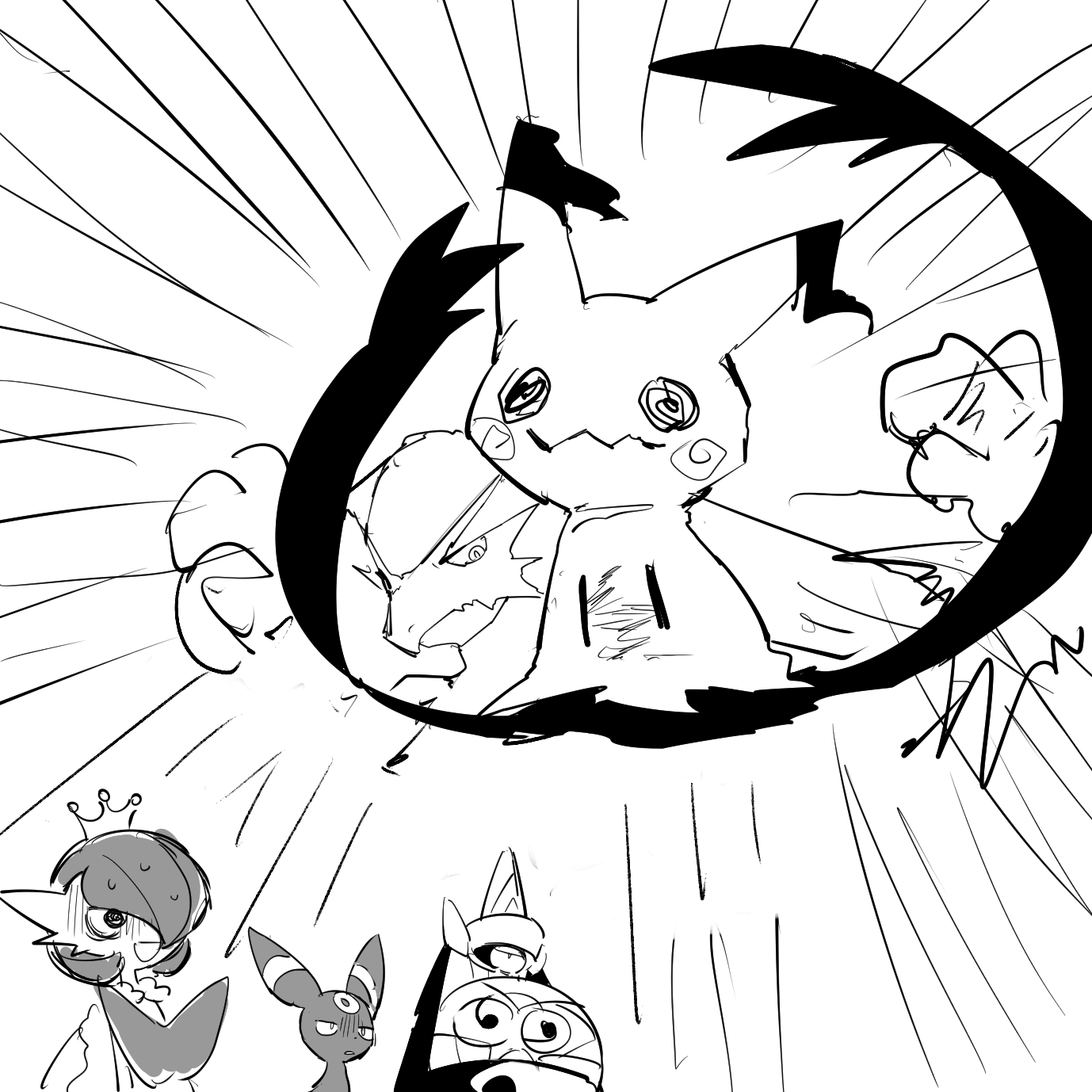 @_@ aegislash apios bad_id bad_pixiv_id blaziken blush_stickers bob_cut cape closed_mouth crown emphasis_lines fur-trimmed_cape fur_trim gardevoir gen_2_pokemon gen_3_pokemon gen_6_pokemon gen_7_pokemon greyscale hair_over_one_eye half-closed_eyes highres looking_at_another looking_up mega_gardevoir mega_pokemon mimikyu monochrome nervous nintendo one-eyed open_mouth pokemon pokemon_(creature) shield short_hair simple_background sketch smile sweat sword turn_pale umbreon upper_body wavy_mouth weapon white_background