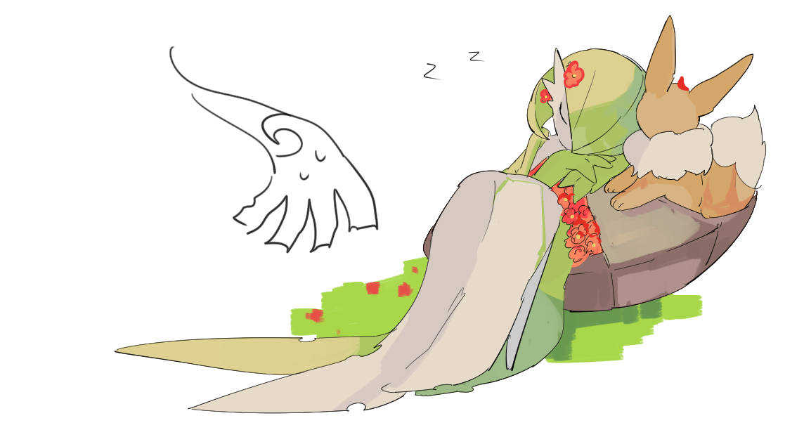 1girl aegislash apios bad_id bad_pixiv_id closed_eyes colored_skin eevee female_focus flower gardevoir gen_1_pokemon gen_3_pokemon gen_6_pokemon grass green_skin hair_flower hair_ornament hair_over_one_eye hands_up lying multicolored_skin nintendo no_feet on_side outdoors own_hands_together pokemon pokemon_(creature) red_flower simple_background sleeping sweat two-tone_skin white_background white_skin zzz