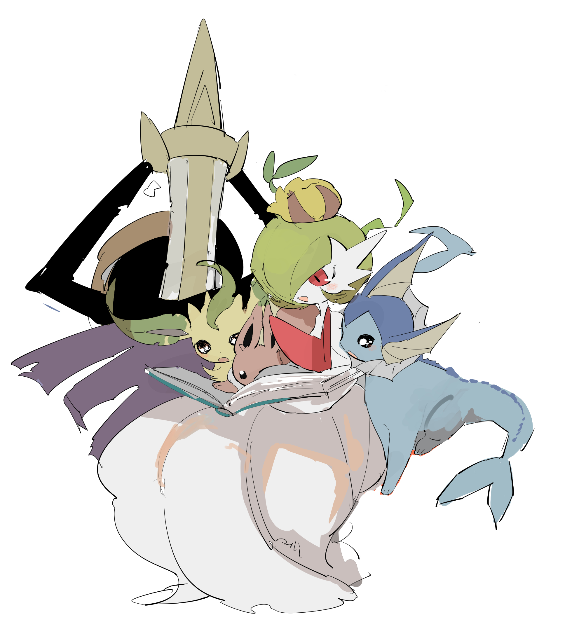 1girl :3 aegislash apios arms_behind_back bad_id bad_pixiv_id black_eyes black_sclera blush bob_cut book brown_sclera closed_eyes closed_mouth colored_sclera colored_skin eevee female_focus flat_chest from_behind full_body gardevoir gen_1_pokemon gen_2_pokemon gen_3_pokemon gen_4_pokemon gen_6_pokemon green_hair hair_over_one_eye happy highres invisible_chair leafeon looking_down mega_gardevoir mega_pokemon nintendo on_head open_book open_mouth pokemon pokemon_(creature) pokemon_on_head reading red_eyes shield short_hair simple_background sitting sketch smile sunkern sword vaporeon weapon white_background white_eyes white_skin