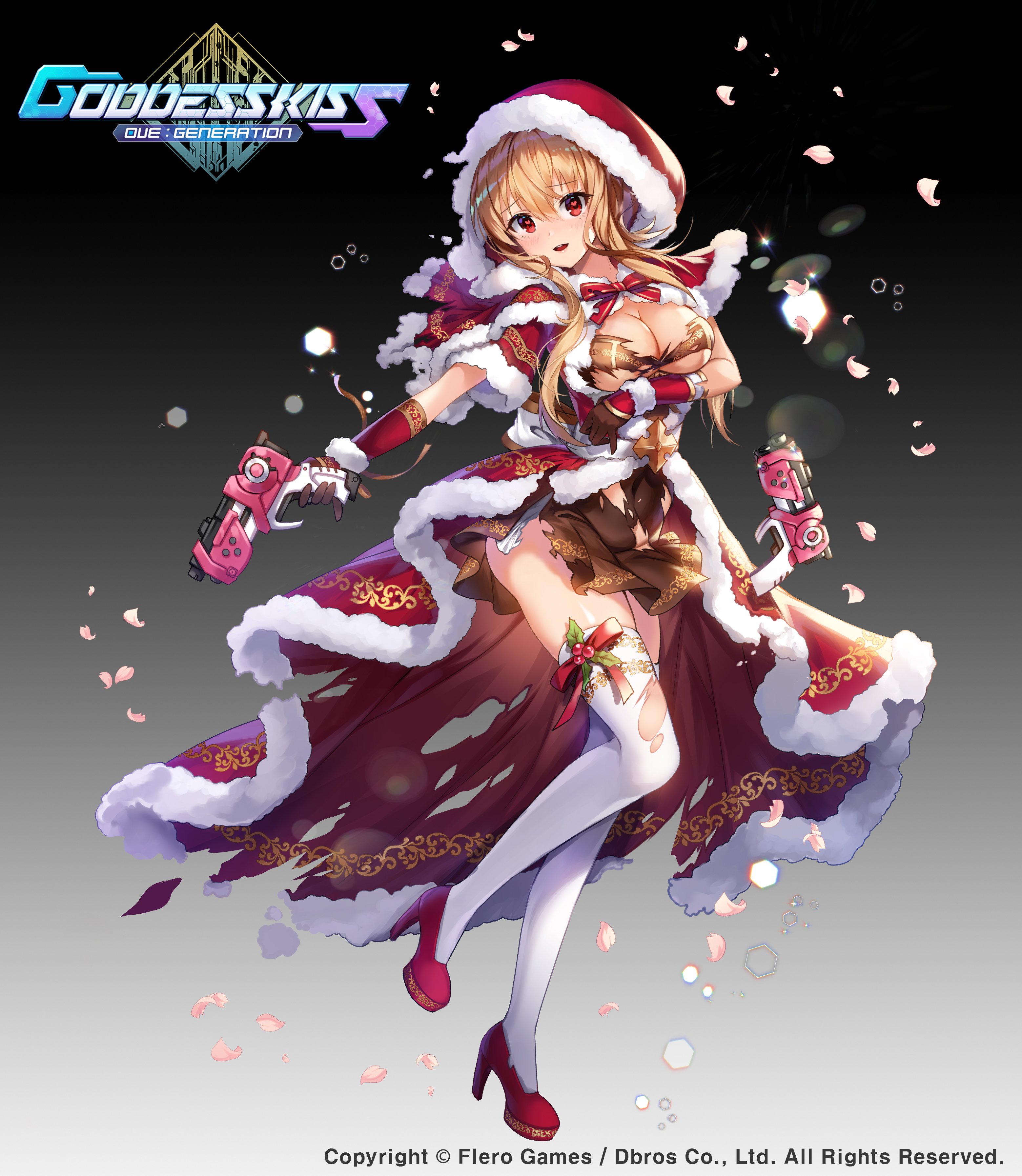 1girl :o absurdres apple_caramel black_gloves bow breast_lift breasts brown_eyes capelet cartina_(goddess_kiss) cleavage company_name copyright_name dual_wielding full_body fur_trim gloves goddess_kiss gradient_background gun heart heart-shaped_pupils high_heels highres holding holding_gun holding_weapon hood long_hair looking_at_viewer medium_breasts official_art petals red_bow red_footwear simple_background solo symbol-shaped_pupils thighhighs torn_clothes watermark weapon white_thighhighs