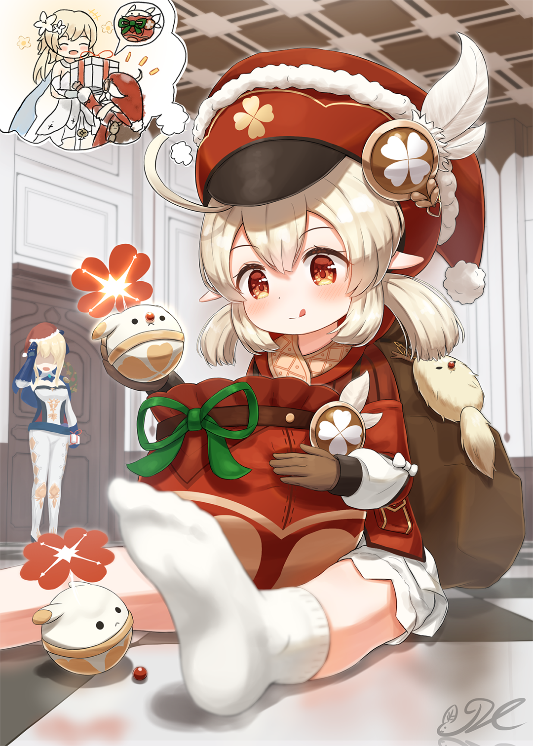 1girl ahoge backpack bag box christmas dress feathers full_body genshin_impact gift gift_box hair_between_eyes hat hat_feather highres j2l jean_(genshin_impact) klee_(genshin_impact) long_hair long_sleeves looking_at_another low_twintails lumine_(genshin_impact) open_mouth pointy_ears red_dress red_eyes red_headwear smile tongue tongue_out twintails white_feathers white_legwear