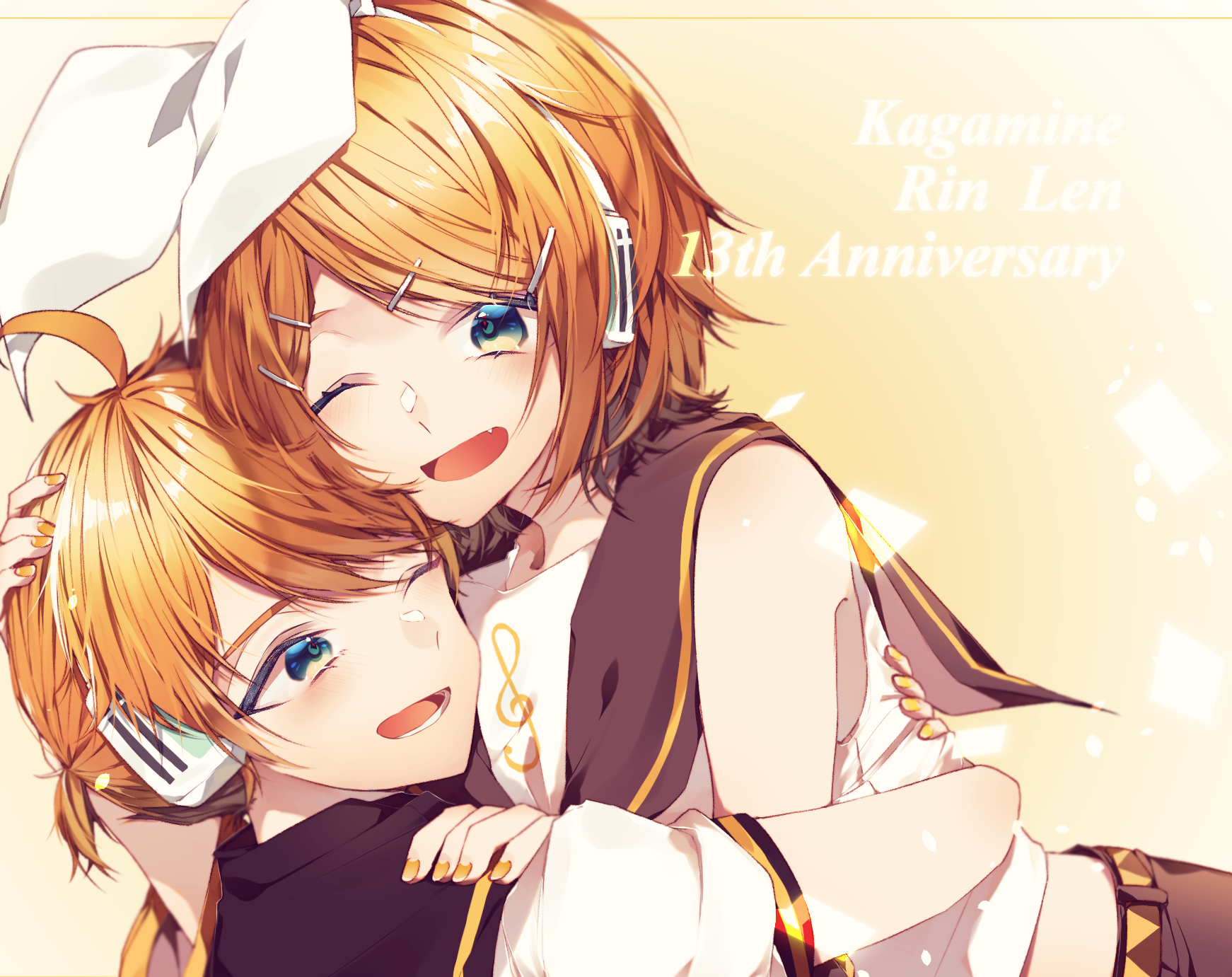 1boy 1girl anniversary arms_around_another's_back bare_shoulders bass_clef belt black_collar blonde_hair blue_eyes bow character_name collar commentary crop_top fang hair_bow hair_ornament hairclip hand_on_another's_shoulder headphones highres hug kagamine_len kagamine_rin looking_at_another looking_at_viewer manya_sora nail_polish one_eye_closed open_mouth ponytail sailor_collar school_uniform shirt short_hair short_ponytail short_sleeves skin_fang sleeveless sleeveless_shirt smile swept_bangs treble_clef upper_body vocaloid white_bow white_shirt yellow_background yellow_nails