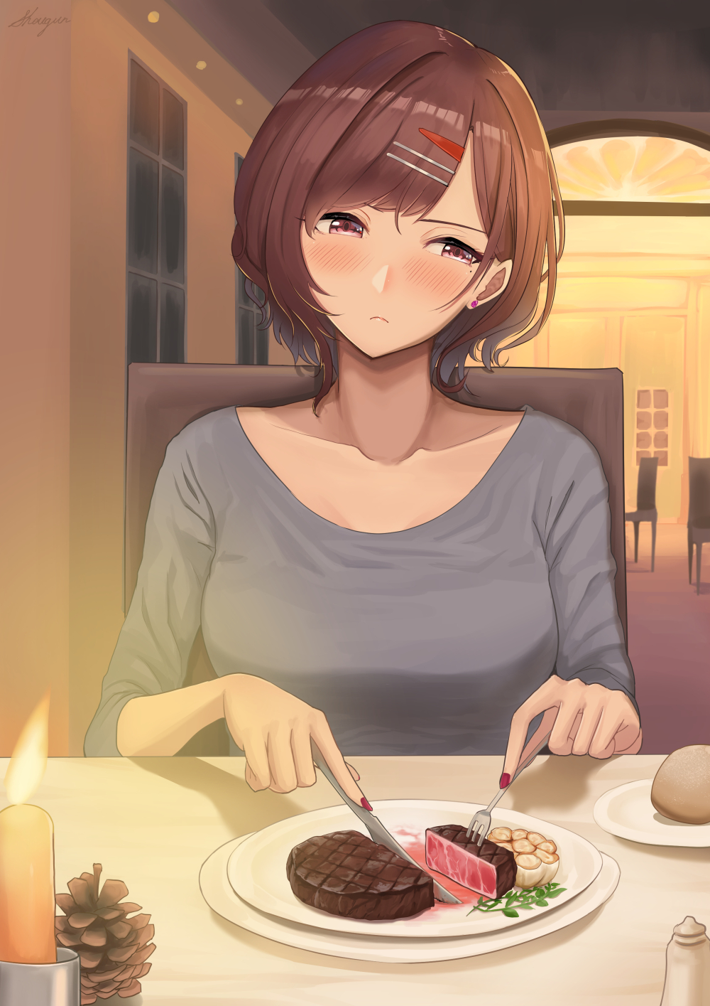 1girl acorn blush bread breasts candle chair collarbone cutting ear_piercing food fork frown garlic grey_shirt hair_ornament hairclip highres higuchi_madoka idolmaster idolmaster_shiny_colors indoors knife long_sleeves meat medium_breasts mole mole_under_eye nail_polish piercing plate purple_eyes red_hair restaurant shirt short_hair shougun_(chuckni1) solo steak table upper_body v-neck window