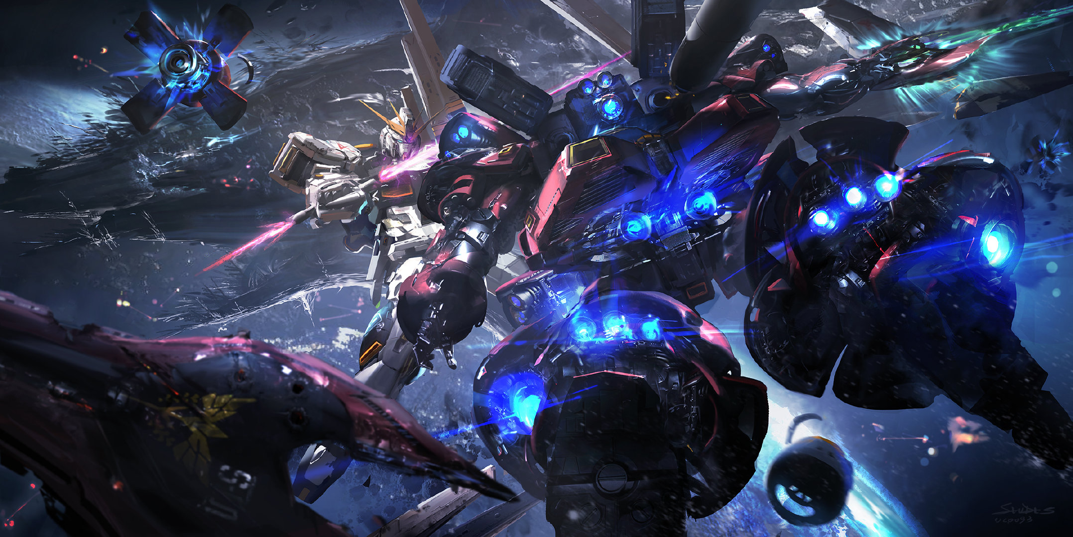 axis_(gundam) beam_axe char's_counterattack energy_sword funnels_(gundam) gundam highres mecha mobile_suit_gundam neo_zeon nu_gundam robot sazabi shield stu_dts sword weapon