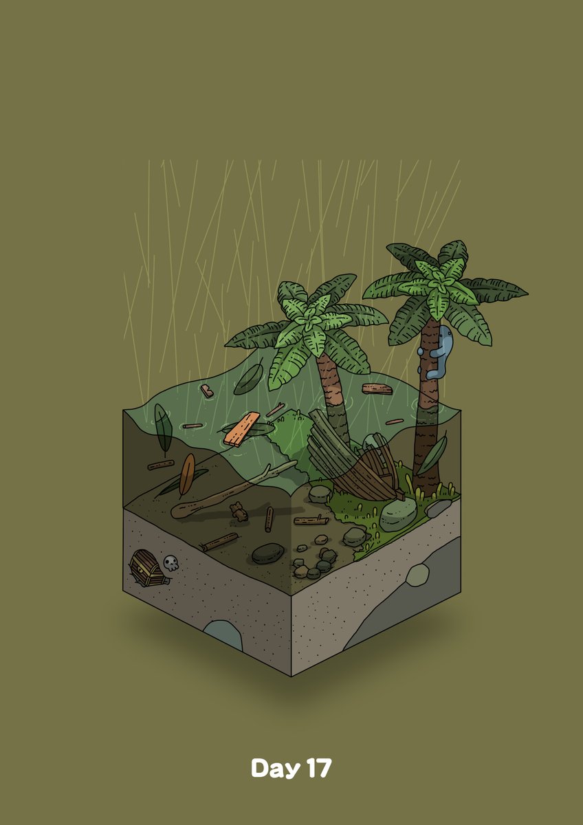 beach climbing commentary_request diorama flood gozz green_background highres isometric original palm_leaf palm_tree plank rain sand shipwreck skull treasure_chest tree