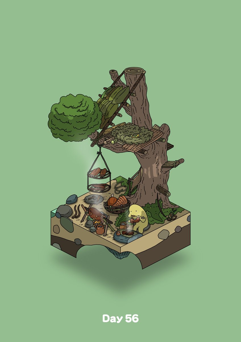 campfire commentary_request cooking diorama eating food gozz green_background highres holding holding_food isometric jewelry meat original palm_leaf pot rotisserie simple_background sitting spitroast tree treehouse