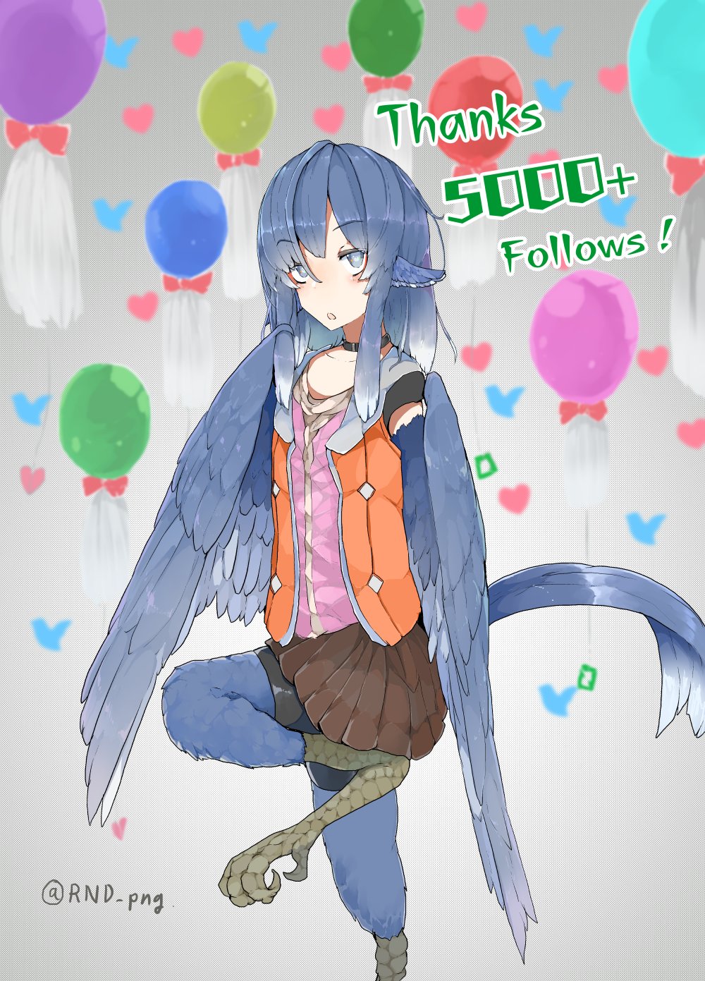 1girl animal_ears balloon bird_ears bird_legs bird_tail bird_wings blue_feathers blue_hair blue_wings blush brown_skirt choker digitigrade english_text feather_hair feathered_wings feathers grey_eyes harpy heart highres medium_hair milestone_celebration miura_(rnd.jpg) monster_girl open_mouth orange_vest original rnd.jpg_(artist) shorts shorts_under_skirt skirt solo standing standing_on_one_leg tail talons twitter_logo twitter_username vest winged_arms wings