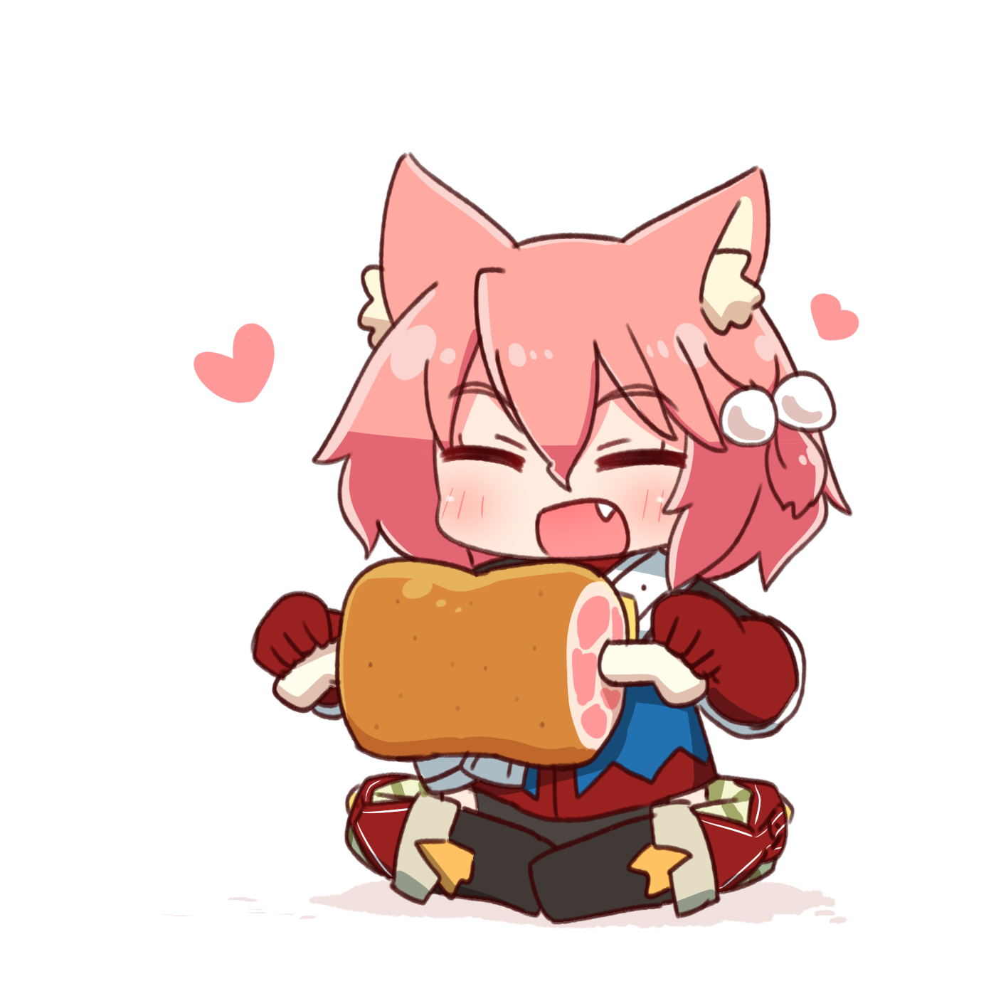 1girl 7th_dragon 7th_dragon_(series) :d ^_^ animal_ear_fluff animal_ears bike_shorts black_boots black_shorts blue_jacket blush boned_meat boots cat_ears chibi closed_eyes commentary_request fang fighter_(7th_dragon) food full_body gloves hair_between_eyes hair_bobbles hair_ornament harukara_(7th_dragon) heart highres holding holding_food jacket knee_boots long_sleeves meat naga_u one_side_up open_mouth pink_hair red_gloves shadow short_shorts shorts sitting smile solo striped_clothes striped_thighhighs thighhighs thighhighs_under_boots white_background