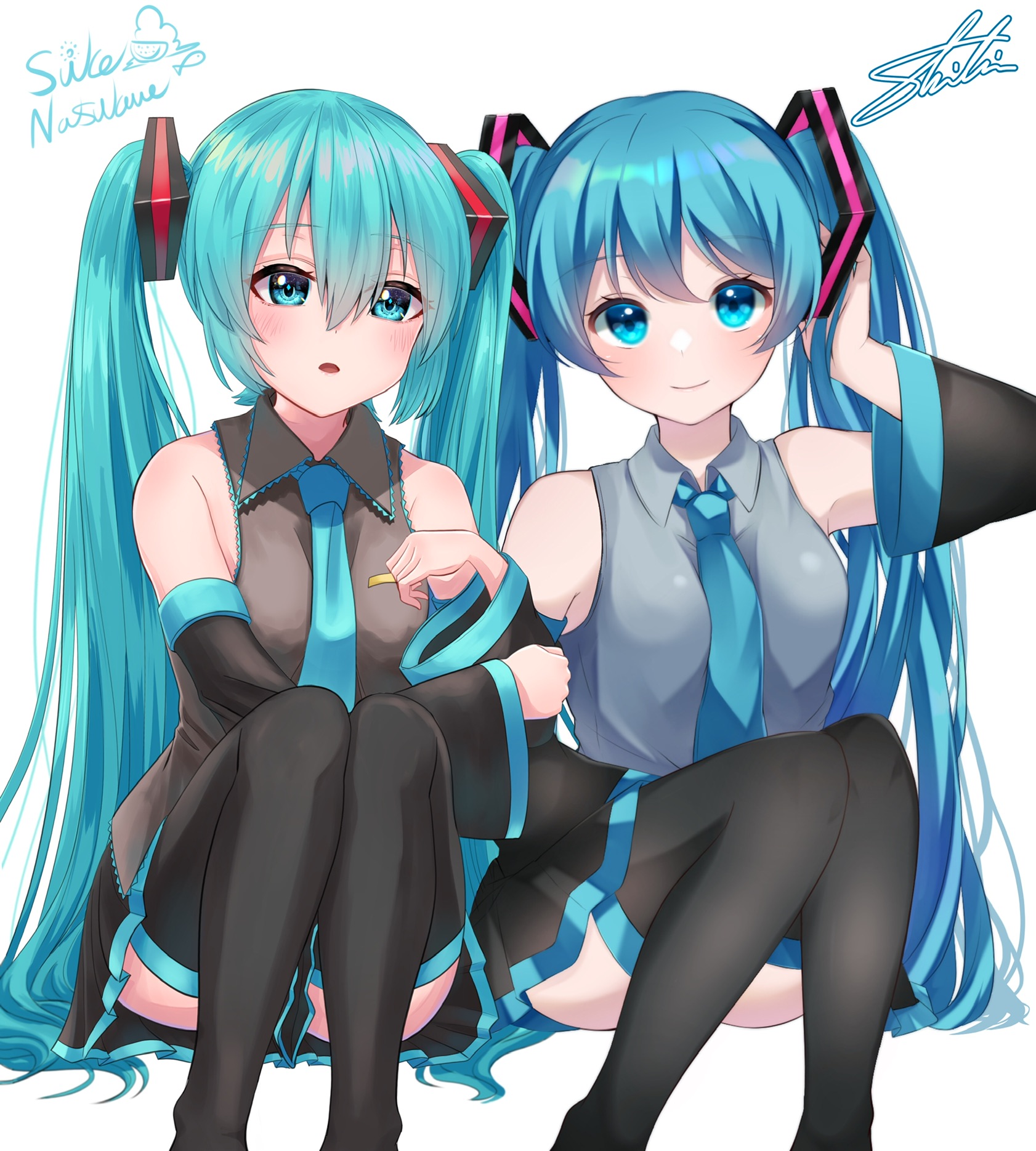 2girls aqua_eyes aqua_hair aqua_necktie artist_collaboration bad_id bad_twitter_id bare_shoulders black_legwear black_skirt black_sleeves blue_eyes blue_hair blue_neckwear commentary detached_sleeves dual_persona feet_out_of_frame grey_shirt hair_ornament hand_in_own_hair hand_up hatsune_miku highres long_hair looking_at_viewer miniskirt multiple_girls necktie parted_lips pleated_skirt shirt side-by-side signature sk_duki skirt sleeveless sleeveless_shirt smile tatyaoekaki thighhighs twintails very_long_hair vocaloid white_background zettai_ryouiki