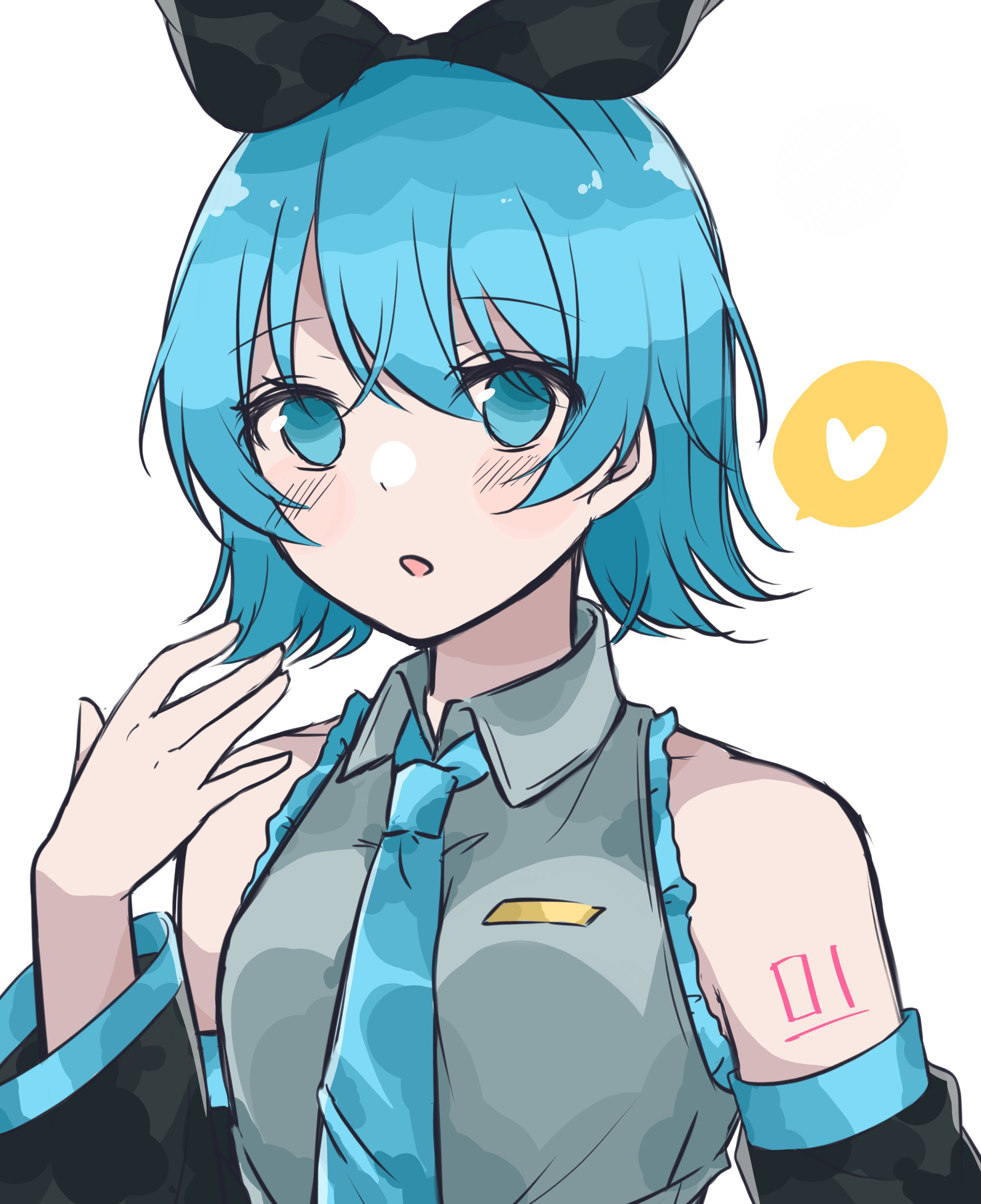 1girl absurdres alternate_hair_length_(shorter) alternate_hairstyle aqua_eyes aqua_hair aqua_necktie bad_id bad_pixiv_id bare_shoulders black_bow black_sleeves bow detached_sleeves grey_shirt hair_bow hairstyle_switch hand_up hatsune_miku heart highres necktie shirt short_hair shoulder_tattoo sk_duki sleeveless sleeveless_shirt solo spoken_heart tattoo vocaloid white_background