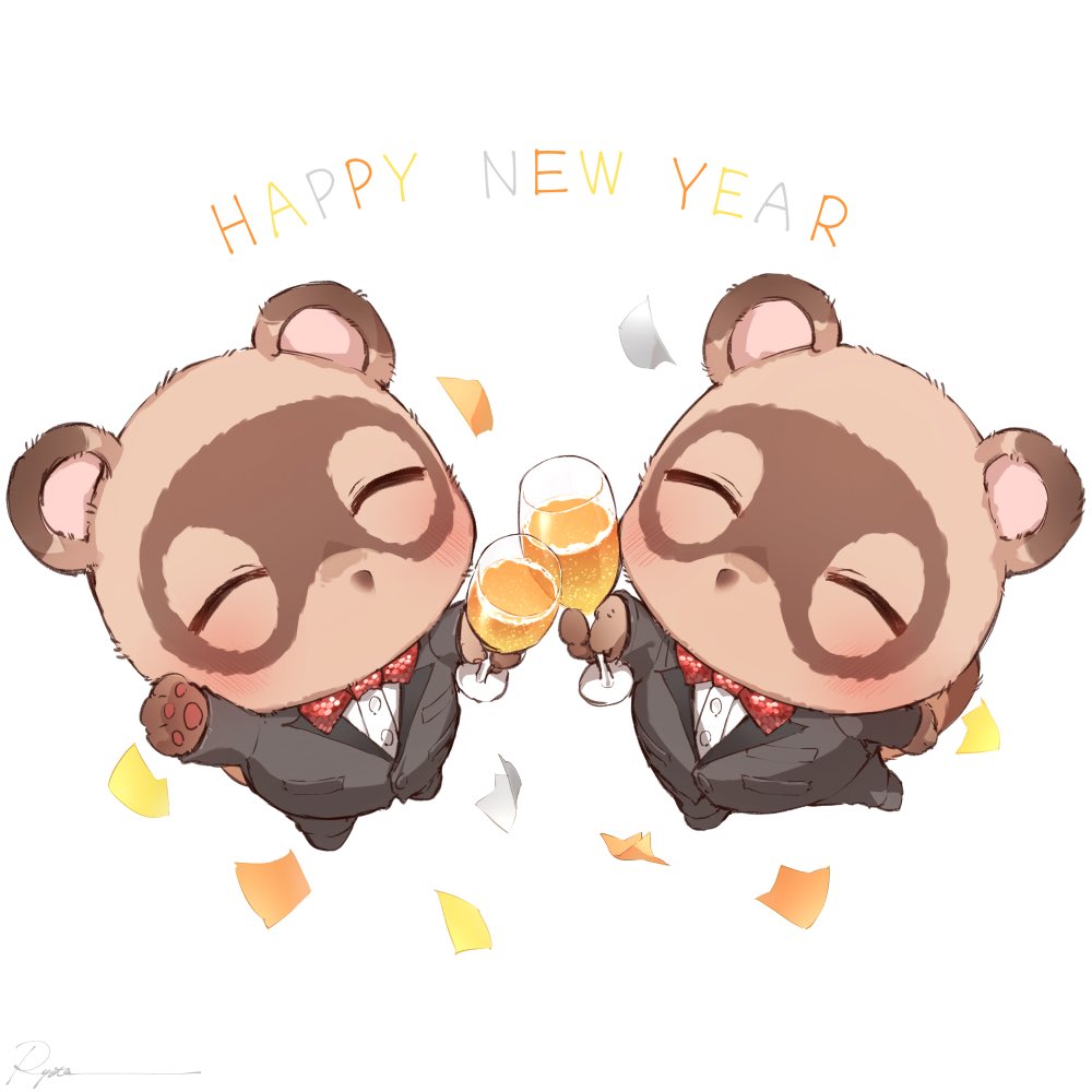 2boys alcohol alternate_costume animal_crossing animal_ears black_jacket black_pants bow bowtie dress_shirt closed_eyes formal_clothes from_above hands_up happy_new_year holding jacket multiple_boys new_year nintendo pants raccoon_boy raccoon_ears raccoon_tail red_bow ryota_(ry_o_ta) shirt tail timmy_(animal_crossing) tommy_(animal_crossing)