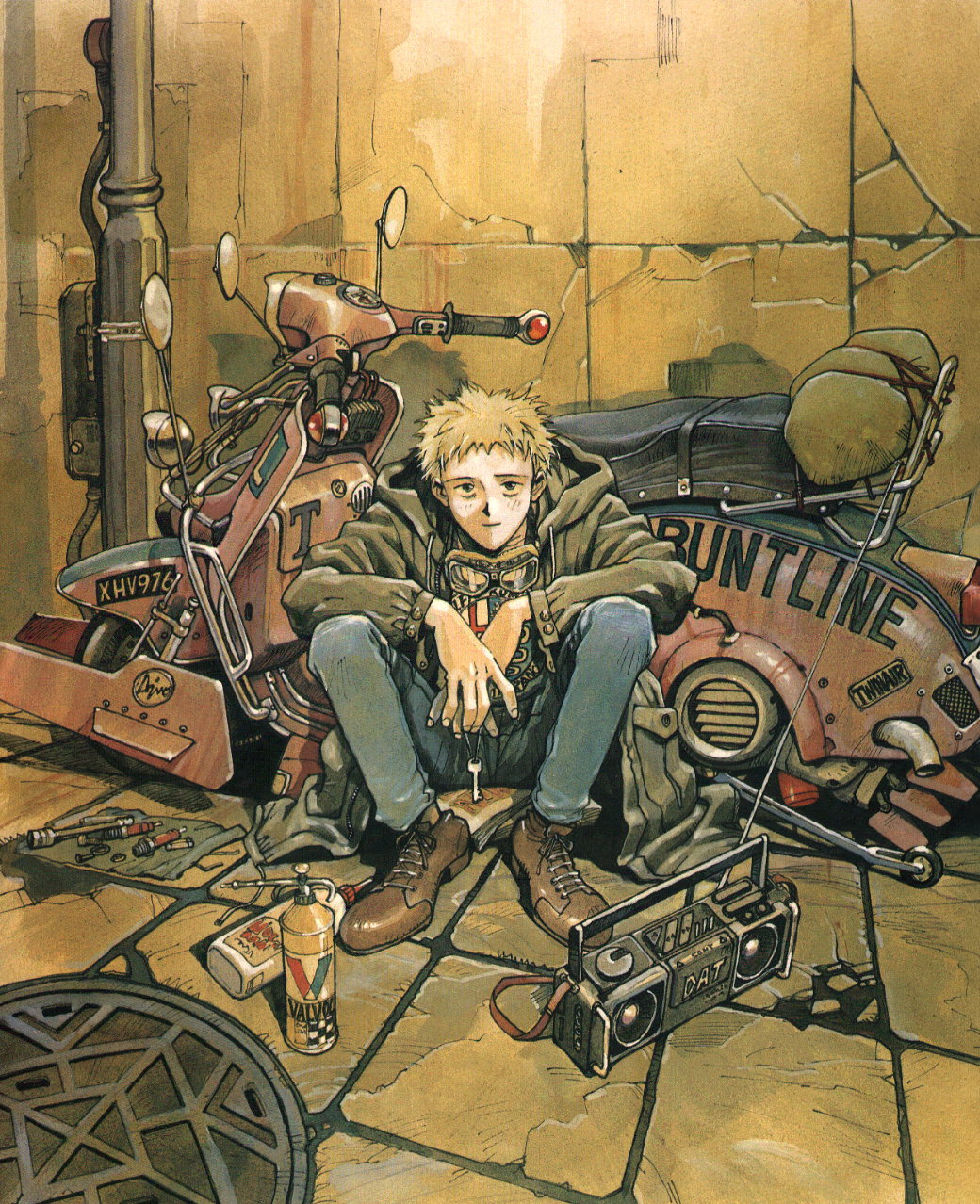1990s_(style) 1boy blonde_hair crack cracked_floor cracked_wall goggles highres key male_focus motor_vehicle motorcycle r20 retro_artstyle sadamoto_yoshiyuki shoes short_hair sitting smile solo sweater tools traditional_media unworn_goggles