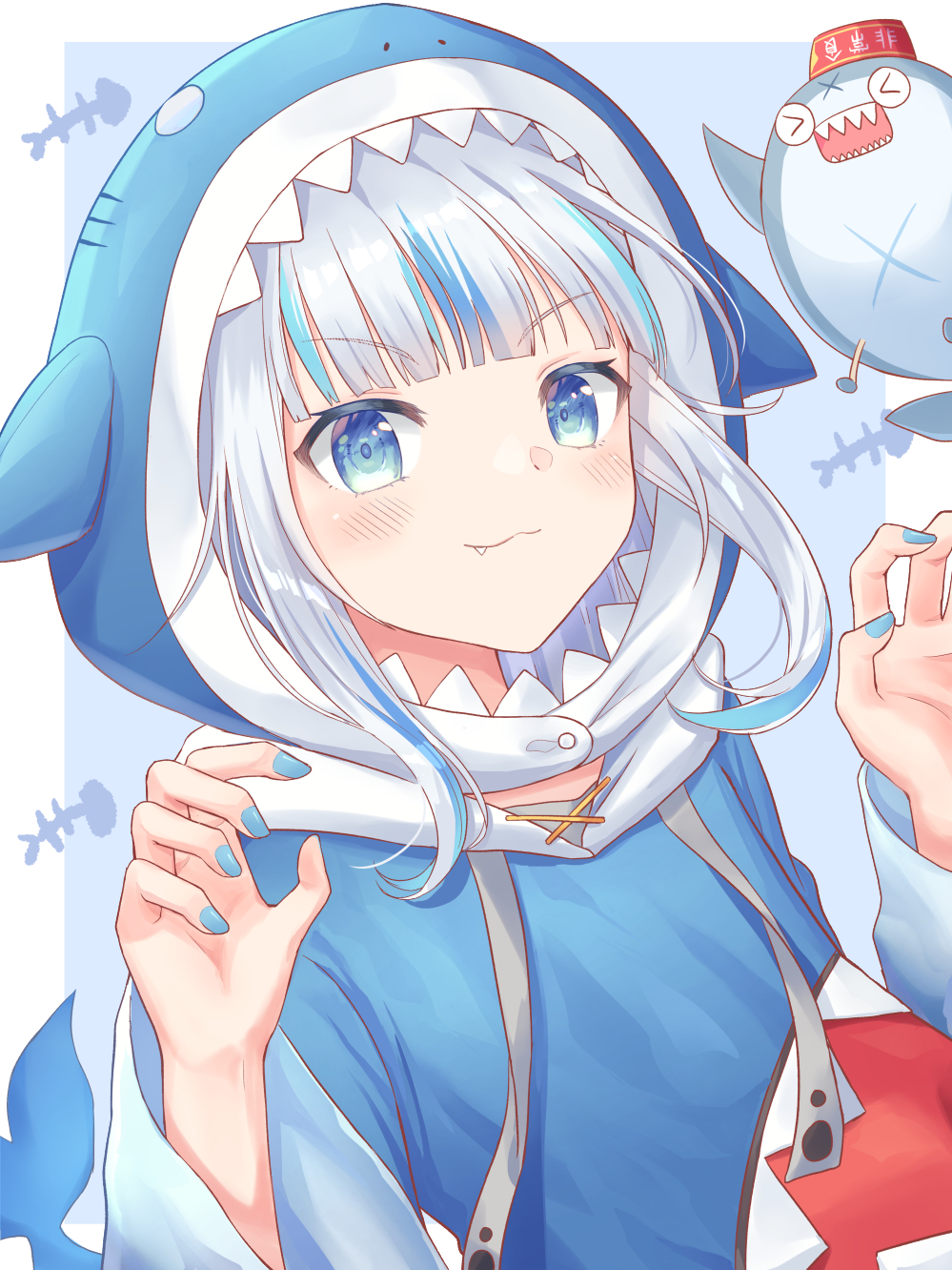 1girl :3 animal_hood aqua_nails bloop_(gawr_gura) blue_eyes blue_hair blue_hoodie blue_nails blunt_bangs blush claw_pose closed_mouth commentary fang fingernails gawr_gura gawr_gura_(1st_costume) hands_up happy highres hololive hololive_english hood hood_up hoodie long_sleeves looking_at_viewer medium_hair multicolored_hair nail_polish portrait red_headwear seungju_lee shark_hood sharp_teeth silver_hair smile streaked_hair teeth upper_body virtual_youtuber x_(symbol)
