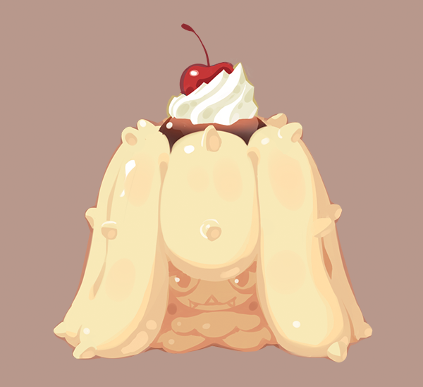 brown_background brown_theme cherry donuttypd food food_focus fruit gen_7_pokemon mareanie nintendo no_humans pokemon pudding simple_background spikes still_life whipped_cream