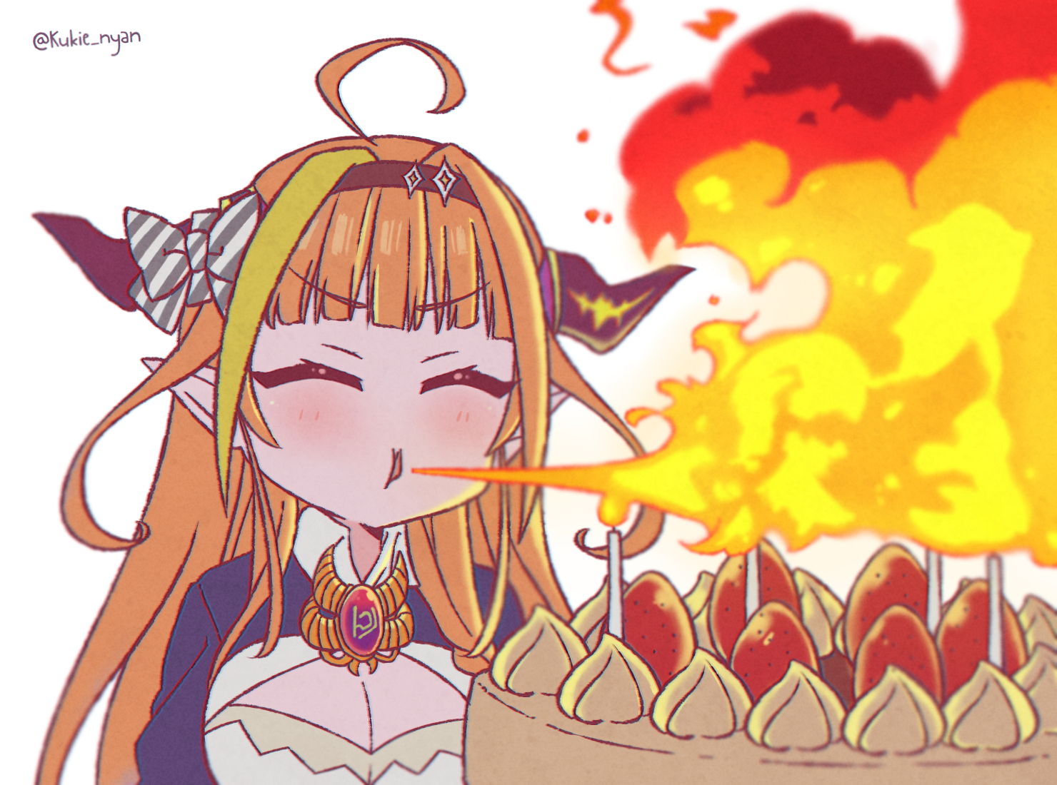 1girl ahoge artist_name birthday birthday_cake black_hairband black_jacket blonde_hair blunt_bangs bow bowtie breast_cutouts breasts breath_weapon breathing_fire brooch cake candle cleavage cleavage_cutout closed_eyes clothing_cutout collared_shirt commentary diagonal-striped_bow dragon_girl dragon_horns english_commentary fire food fruit gem hairband hololive horn_bow horn_ornament horns jacket jewelry kiryu_coco kiryu_coco_(1st_costume) kukie-nyan long_hair multicolored_hair orange_hair pointy_ears shirt solo strawberry streaked_hair striped_bow virtual_youtuber white_background white_shirt