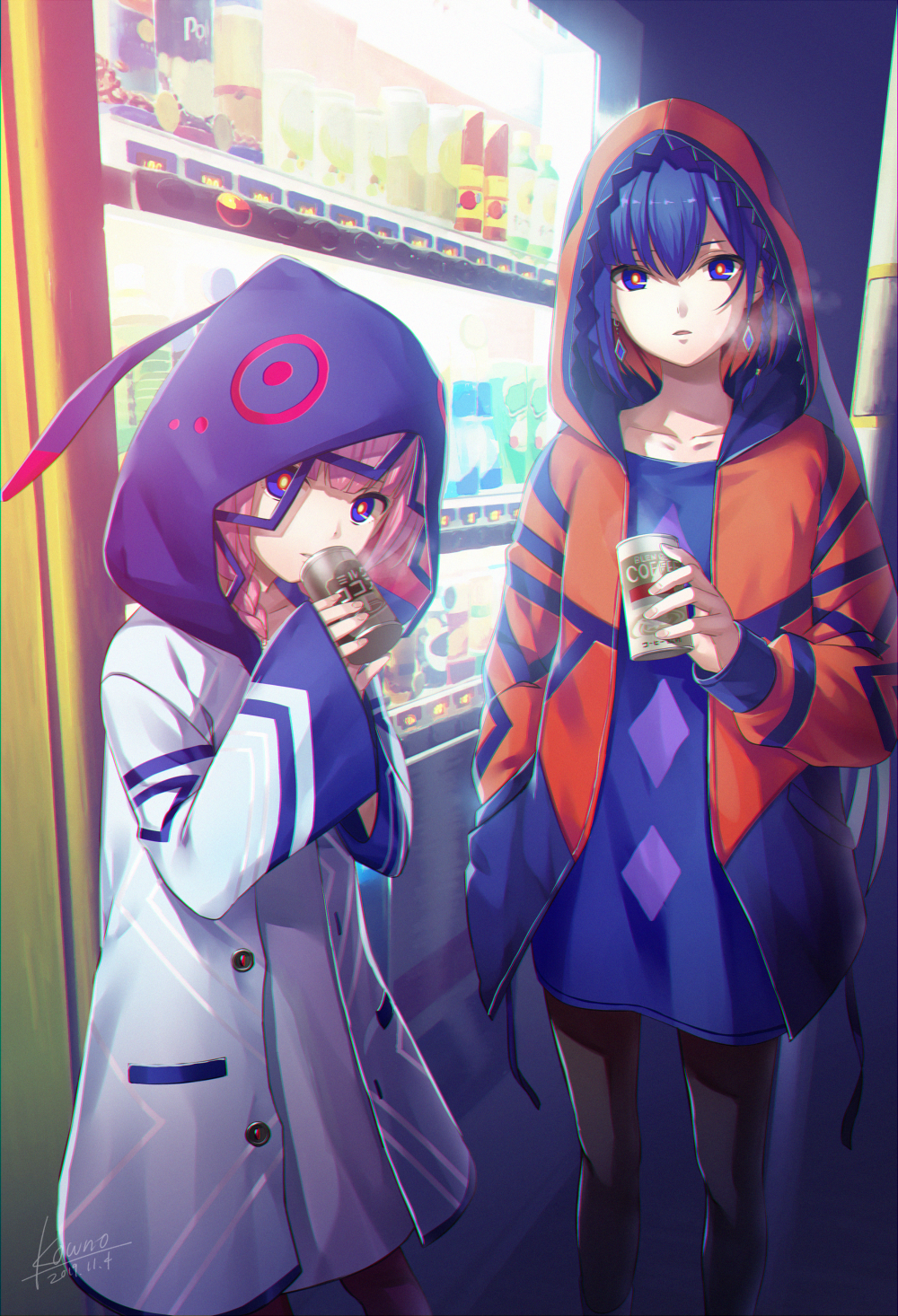 2girls black_pants blue_eyes blue_shirt braid coffee dated earrings glowing hands_in_sleeves highres hood hood_up hooded_jacket hoodie jacket jewelry kaf_(kamitsubaki_studio) kamitsubaki_studio kounorino long_hair long_sleeves looking_at_viewer low_twin_braids multicolored_eyes multicolored_hair multiple_girls night pants pink_hair red_eyes red_hair red_hood red_hoodie red_jacket rim_(kamitsubaki_studio) shirt short_hair side_braid twin_braids vending_machine virtual_youtuber yellow_eyes