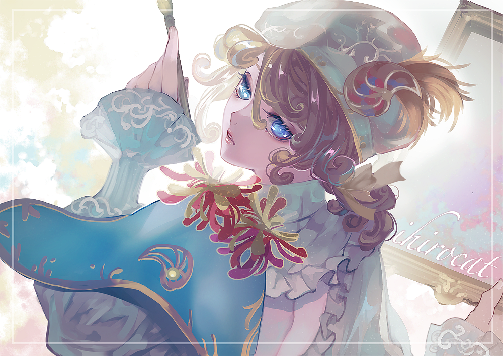 1boy artist_name backless_outfit beret blonde_hair blue_capelet blue_eyes blue_neckwear bow capelet edgar_valden edgar_valden_(golden_ratio) eyeshadow frilled_sleeves frills golden_ratio_(identity_v) hair_between_eyes hair_bow hat hat_feather holding identity_v ihirocat light_particles long_sleeves looking_at_viewer makeup male_focus paintbrush painting_(object) parted_lips ponytail puffy_sleeves red_eyeshadow ribbon shirt simple_background sleeves_past_wrists solo white_hat white_shirt