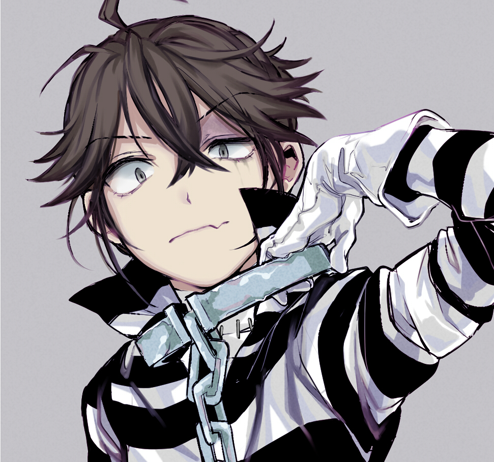 1boy ahoge bandages brown_hair bruise bruised_eye chain fang gloves grey_background grey_eyes hair_between_eyes identity_v ieiieiiei injury long_sleeves luca_balsa male_focus messy_hair popped_collar prison_clothes prisoner shirt short_hair simple_background skin_fang solo striped_clothes striped_shirt