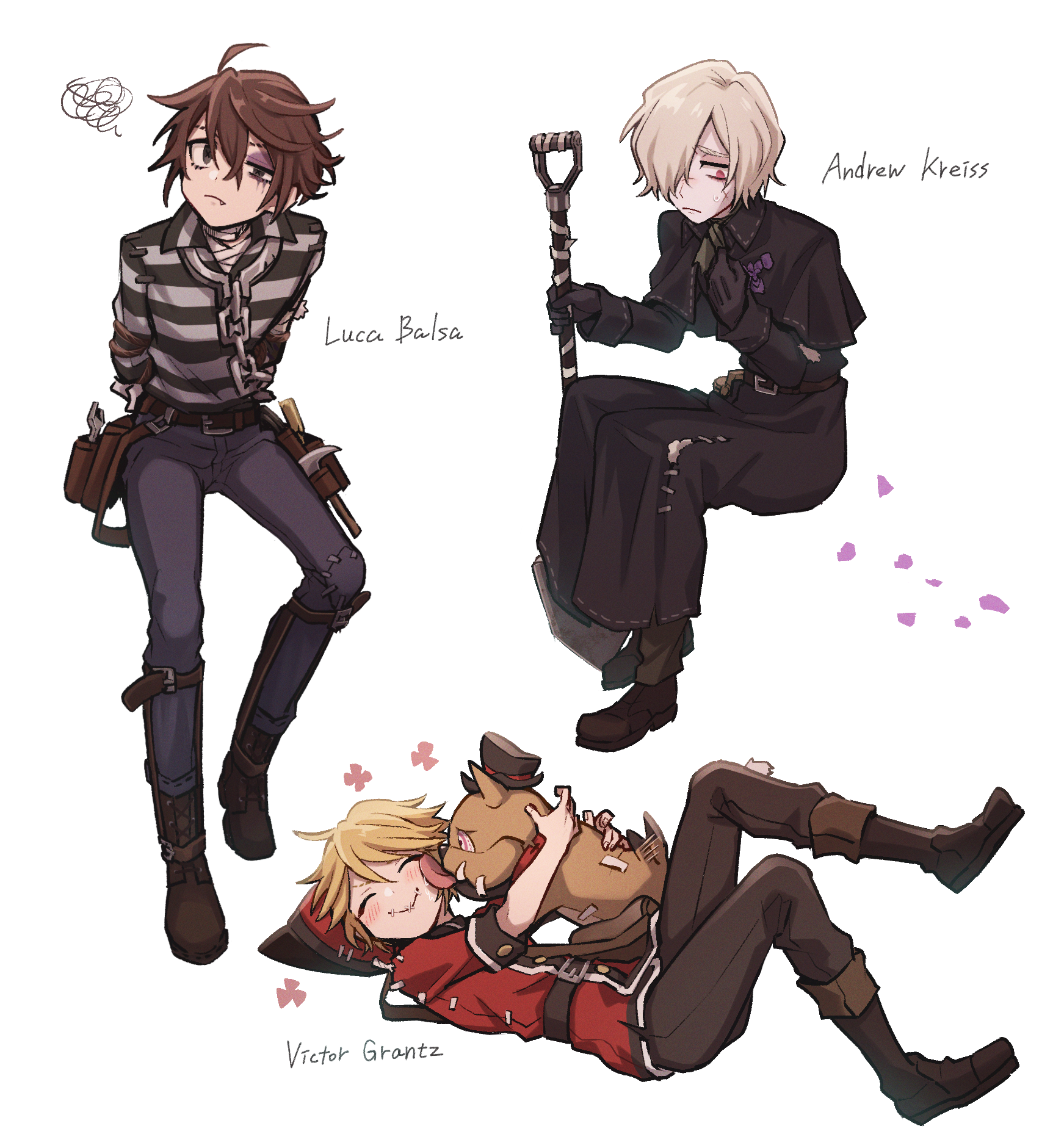 3boys albino andrew_kreiss animal arms_behind_back bandages bdsm belt black_eyes black_gloves blonde_hair blush bondage bound bound_arms brown_footwear brown_hair bruise bruised_eye capelet chain character_name closed_eyes closed_mouth coat dog facial_scar fang fang_out film_grain flower full_body gloves green_neckwear hair_over_one_eye haizai hammer hand_on_own_chest hat highres holding holding_shovel identity_v injury invisible_chair iris_(flower) leg_up long_sleeves luca_balsa lying male_focus multiple_boys on_back petals ponytail popped_collar prison_clothes prisoner red_eyes red_headwear rope scar scar_on_cheek scar_on_face scar_on_nose screwdriver shirt short_hair shovel simple_background sitting smile squiggle standing stitched_mouth stitches striped_clothes striped_shirt sweat unworn_hat unworn_headwear victor_grantz white_background white_gloves white_hair wrench