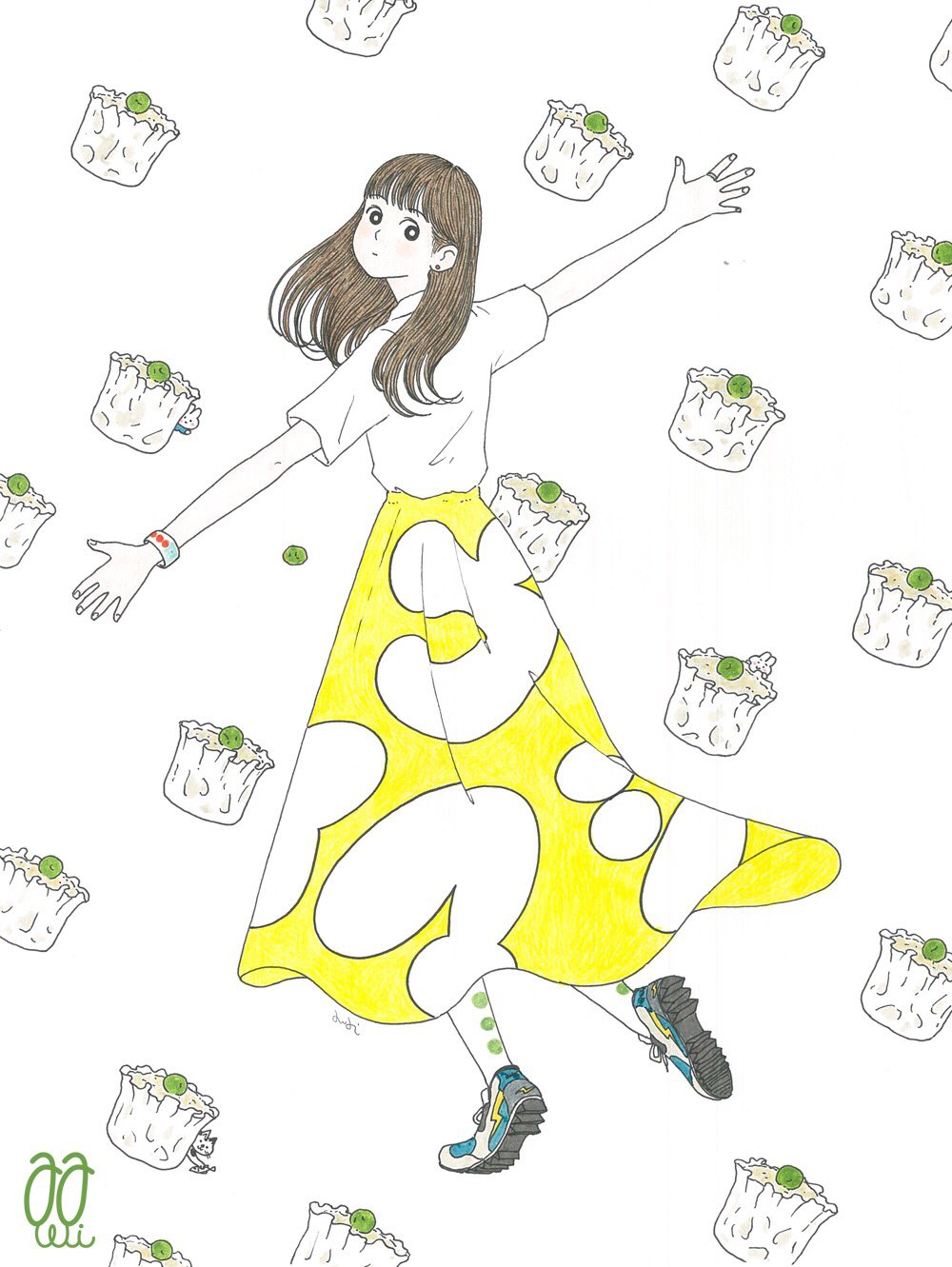 1girl awai_(awaiwaiwai) black_eyes blunt_bangs bright_pupils brown_hair from_behind full_body highres long_hair original outstretched_arms patterned_background print_skirt signature skirt solo spread_arms standing white_pupils yellow_skirt