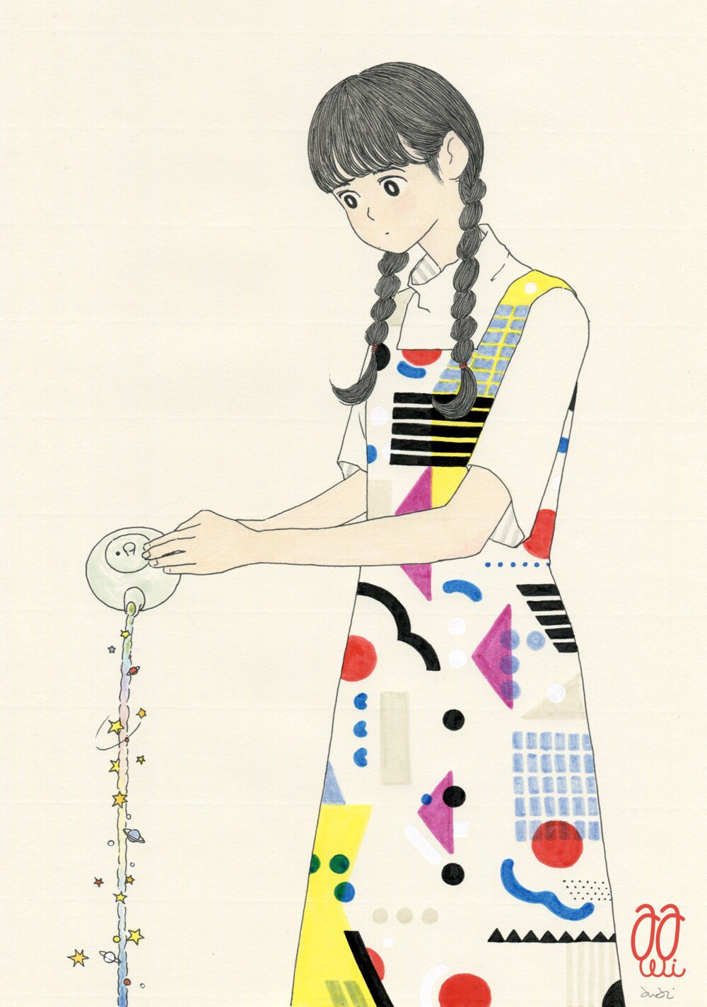 1girl awai_(awaiwaiwai) back_hair black_eyes braid bright_pupils cowboy_shot dress highres long_hair original print_dress shirt short_sleeves signature simple_background solo tan_background teapot triangle twin_braids white_pupils white_shirt