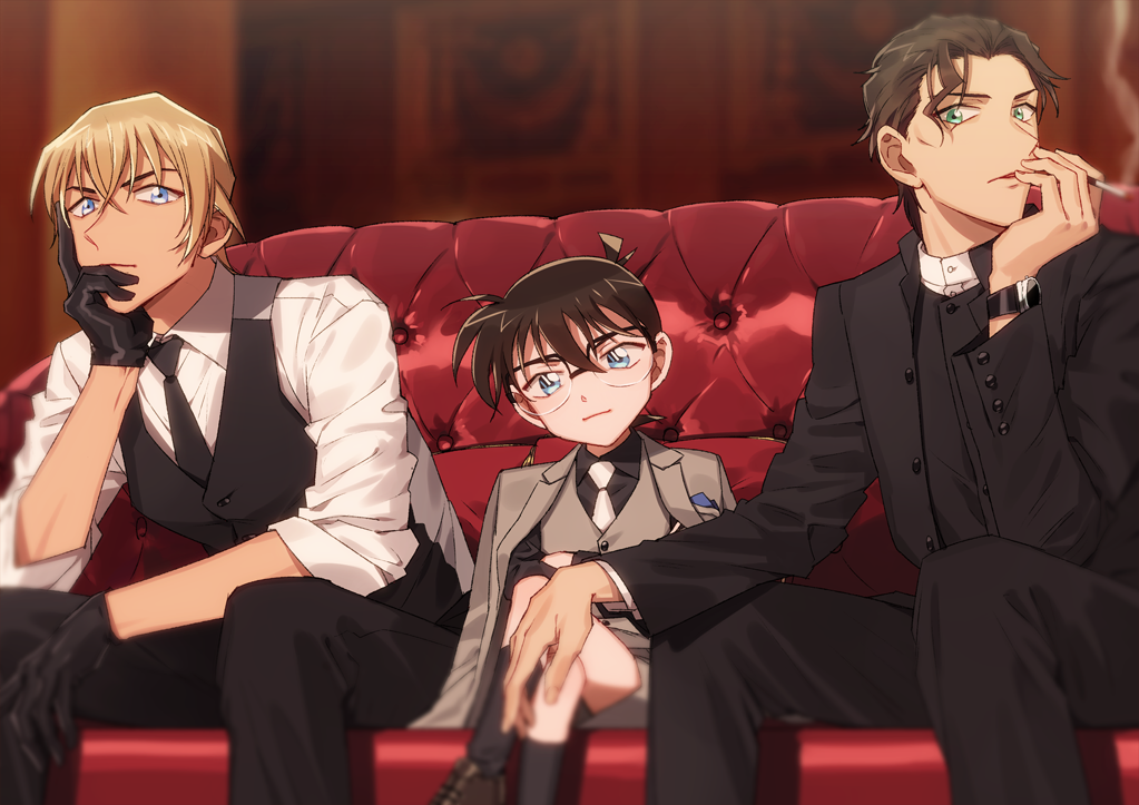 3boys akai_shuuichi amuro_tooru black-framed_eyewear black_gloves black_hair black_jacket black_neckwear black_pants black_shirt black_socks black_vest blonde_hair blue_eyes blurry blurry_background brown_footwear brown_hair buttons child cigarette closed_mouth collared_shirt commentary_request couch crossed_legs edogawa_conan feet_out_of_frame glasses gloves green_eyes grey_neckwear grey_vest hair_between_eyes hand_on_own_chin hand_on_own_face holding holding_cigarette indoors jacket jacket_on_shoulders k_(gear_labo) kneehighs long_sleeves looking_at_viewer male_focus meitantei_conan multiple_boys necktie on_couch open_clothes open_jacket open_mouth pants serious shirt shoes short_hair sitting sleeves_rolled_up smoke smoking socks vest watch white_shirt wristwatch