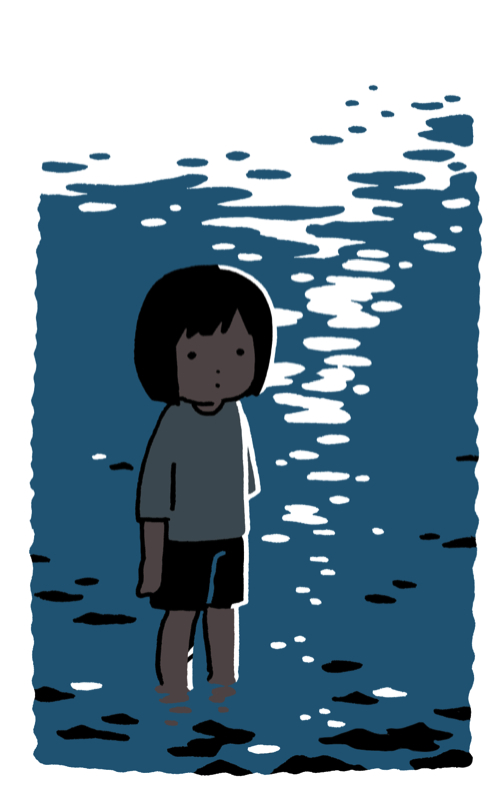 1girl arms_at_sides backlighting black_hair black_shorts blending border child closed_mouth dot_mouth dot_nose expressionless from_side hirasawa_minami looking_at_viewer original outdoors refraction shirt short_hair short_sleeves shorts solo standing wading water white_border
