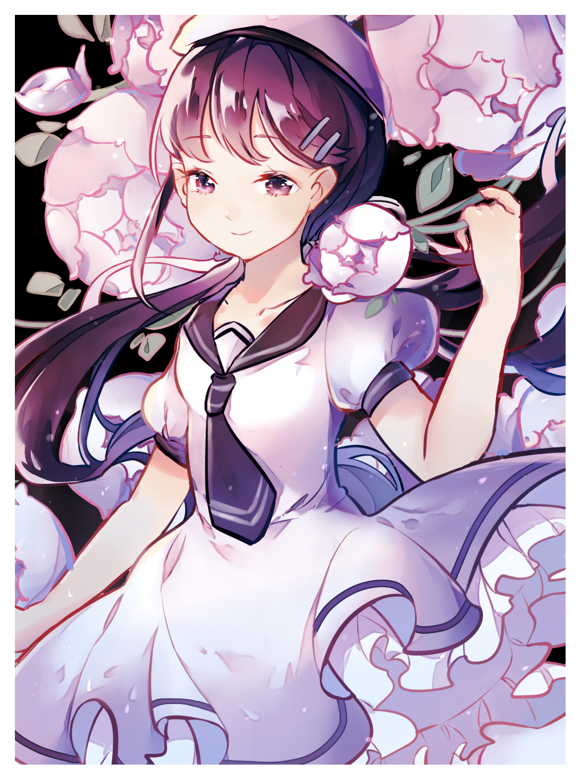 1girl beret black_collar black_necktie chinese_commentary collar commentary dress flower frilled_dress frills hair_ornament hairclip hand_up hat highres holding holding_flower long_hair necktie puffy_short_sleeves puffy_sleeves purple_eyes purple_hair sailor_collar short_sleeves smile solo upper_body vocaloid white_dress white_flower white_hat xin_hua yue_yuan_(1234qwea)