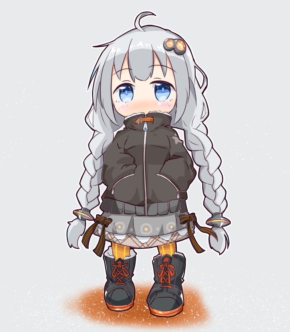 1girl ahoge black_boots black_coat blue_eyes blush boots braid chibi coat commentary covered_mouth grey_background grey_hair grey_skirt hair_ornament hair_tubes hands_in_pockets kizuna_akari layered_skirt long_hair looking_at_viewer orange_legwear skirt solo twin_braids very_long_hair voiceroid yamainu_luna