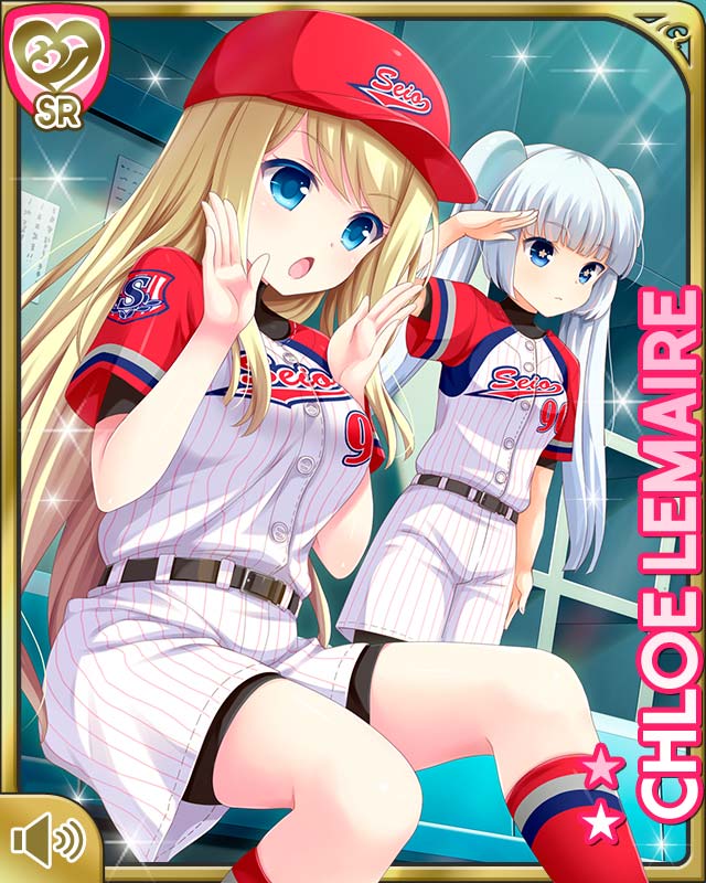 2girls :o baseball_cap baseball_uniform blonde_hair blue_eyes breasts card_(medium) character_name chloe_lemaire closed_mouth day girlfriend_(kari) hat large_breasts long_hair miss_monochrome miss_monochrome_(character) multiple_girls official_art open_mouth outdoors qp:flapper shirt sitting sportswear standing tagme